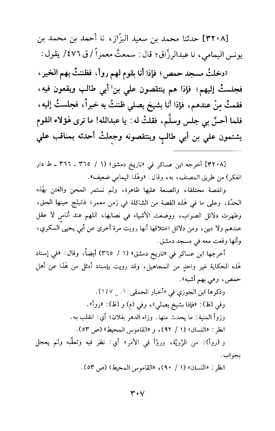 3208 - حَدَّثَنَا مُحَمَّدُ بْنُ سَعِيدٍ الْبَزَّازُ، نا أَحْمَدُ بْنُ مُحَمَّدِ بْنِ يُونُسَ الْيَمَامِيُّ، نا عَبْدُ الرَّزَّاقِ؛ قَالَ: سَمِعْتُ مَعْمَرًا يَقُولُ: دَخَلْتُ مَسْجِدَ حِمْصَ؛ فَإِذَا أَنَا بِقَوْمٍ لَهُمْ رَوَأٌ، فَظَنَنْتُ بِهِمُ الْخَيْرَ، فَجَلَسْتُ إِلَيْهِمْ؛ فَإِذَا هُمْ يَنْتَقِصُونَ عَلِيَّ بْنَ أَبِي طَالِبٍ وَيَقَعُونَ فِيهِ، فَقُمْتُ مِنْ عِنْدِهِمْ، فَإِذَا أَنَا بِشَيْخٍ يُصَلِّي ظَنَنْتُ بِهِ خَيْرًا، فَجَلَسْتُ إِلَيْهِ، فَلَمَّا أَحَسَّ بِي جَلَسَ وَسَلَّمَ، فَقُلْتُ لَهُ: يَا عَبْدَ اللهِ! مَا تَرَى هَؤُلاءِ الْقَوْمَ يَشْتِمُونَ عَلِيَّ بْنَ أَبِي طَالِبٍ وَيَنْتَقِصُونَهُ؟ ! وَجَعَلْتُ أُحَدِّثُهُ بِمَنَاقِبِ عَلِيٍّ -[308]- رَضِيَ اللهُ عَنْهُ، وَأَنَّهُ زَوْجُ فَاطِمَةَ بِنْتِ رَسُولِ اللهِ صَلَّى اللَّهُ عَلَيْهِ وَسَلَّمَ وَأَبُو الْحَسَنِ وَالْحُسَيْنِ، وَابْنُ عَمِّ رَسُولِ اللهِ صَلَّى اللَّهُ عَلَيْهِ وَسَلَّمَ. فَقَالَ لِي: يَا عَبْدَ اللهِ! مَا لَقِيَ النَّاسُ مِنَ النَّاسِ؟ ! لَوْ أَنَّ أَحَدًا نَجَا مِنَ النَّاسِ لَنَجَا مِنْهُمْ أَبُو مُحَمَّدٍ رَحِمَهُ اللهُ، هُوَ ذَا يُشْتَمُ وَيُنْتَقَصُ. قَالَ: قُلْتُ: وَمَنْ أَبُو مُحَمَّدٍ؟ قَالَ: الْحَجَّاجُ بْنُ يُوسُفَ رَحِمَهُ اللهُ. وَجَعَلَ يَبْكِي، فَقُمْتُ عَنْهُ وَقُلْتُ: لا أَسْتَحِلُّ أَنْ أَبِيتَ بِهَا، فَخَرَجْتُ مِنْ يَوْمِي