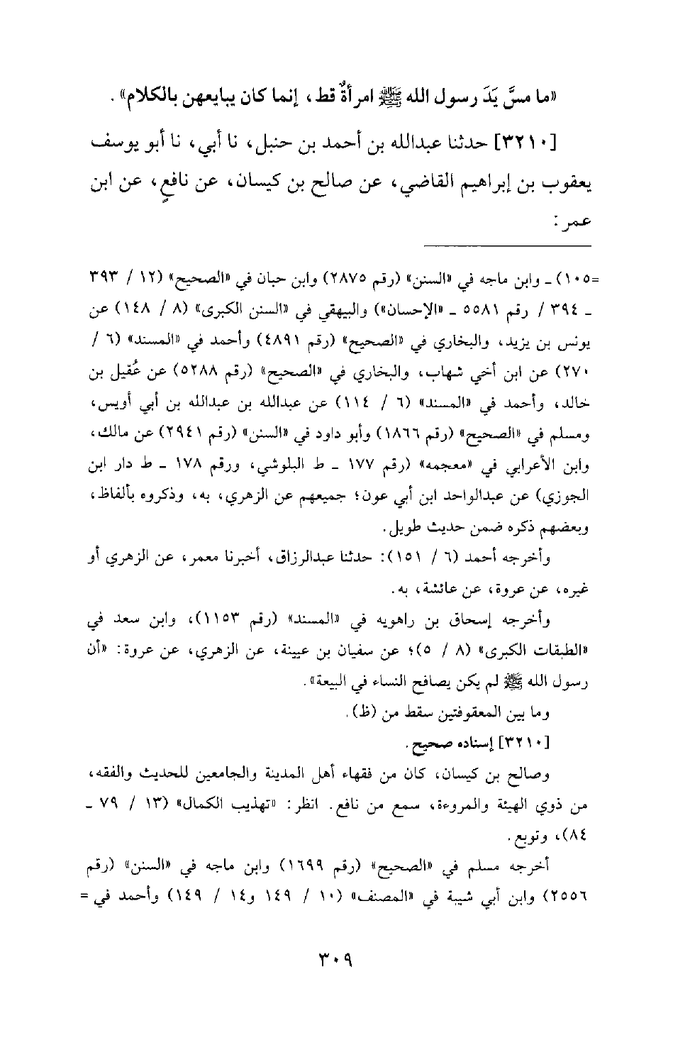 3210 - حَدَّثَنَا عَبْدُ اللهِ بْنُ أَحْمَدَ بْنِ حَنْبَلٍ، نا أَبِي، نا أَبُو يُوسُفَ يَعْقُوبُ بْنُ إِبْرَاهِيمَ الْقَاضِي، عَنْ صَالِحِ بْنِ كَيْسَانَ، عَنْ نَافِعٍ، عَنِ ابْنِ عُمَرَ: -[311]- أَنَّ النَّبِيَّ صَلَّى اللَّهُ عَلَيْهِ وَسَلَّمَ رَجَمَ يَهُودِيًّا وَيَهُودِيَّةً