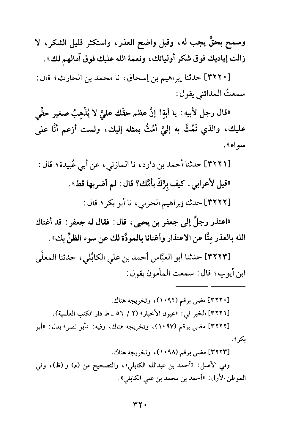 3222 - حَدَّثَنَا إِبْرَاهِيمُ الْحَرْبِيُّ، نا أَبُو بَكْرٍ؛ قَالَ: اعْتَذَرَ رَجُلٌ إِلَى جَعْفَرِ بْنِ يَحْيَى، قَالَ: فَقَالَ لَهُ جَعْفَرٌ: قَدْ أَغْنَاكَ اللهُ بِالْعُذْرِ مِنَّا عَنِ الاعْتِذَارِ، وَأَغْنَانَا بِالْمَوَدَّةِ لَكَ عَنْ سُوءِ الظَّنِّ بِكَ.
