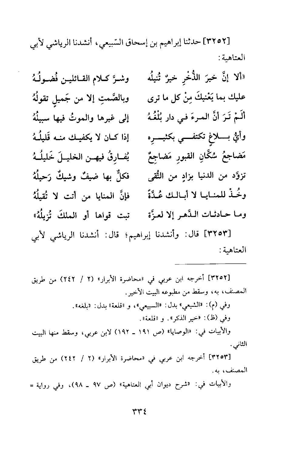 3253 - قَالَ: وَأَنْشَدَنَا إِبْرَاهِيمُ، قَالَ: أَنْشَدَنَا الرِّيَاشِيُّ لِأَبِي الْعَتَاهِيَةِ -[335]-: