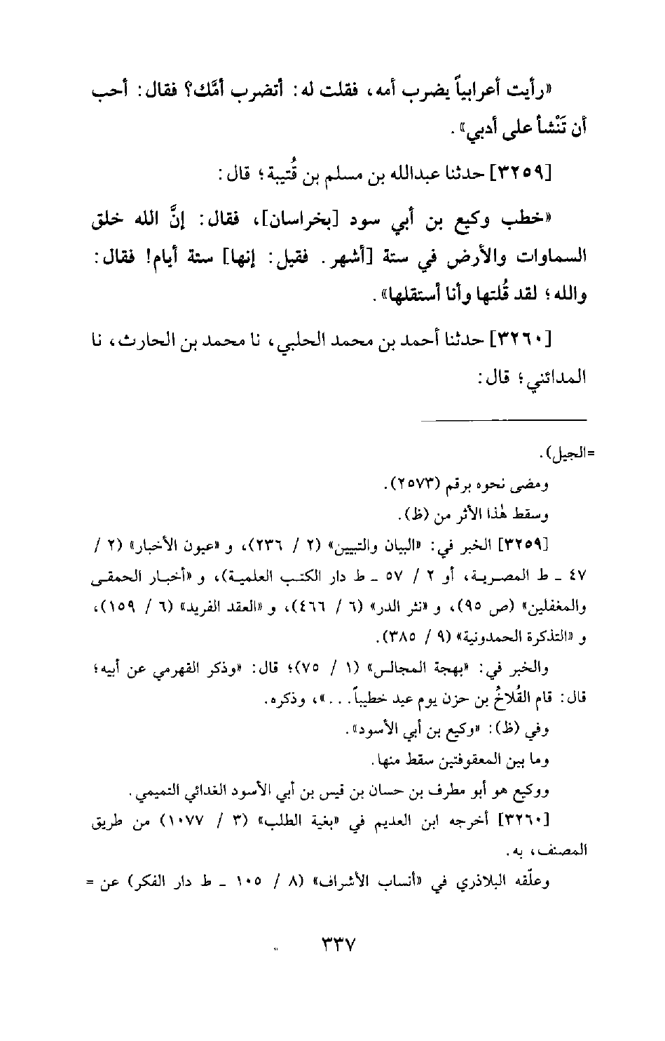 3259 - حَدَّثَنَا عَبْدُ اللهِ بْنُ مُسْلِمِ بْنِ قُتَيْبَةَ؛ قَالَ: خَطَبَ وكيع بن أبي الأسود بِخُرَاسَانَ؛ فَقَالَ: إِنَّ اللهَ خلق السماوات وَالأَرْضَ فِي سِتَّةِ أَشْهُرٍ. فَقِيلَ: إِنَّهَا سِتَّةُ أَيَّامٍ! فَقَالَ: وَاللهِ! لَقَدْ قُلْتُهَا وَأَنَا أَسْتَقِلُّهَا.