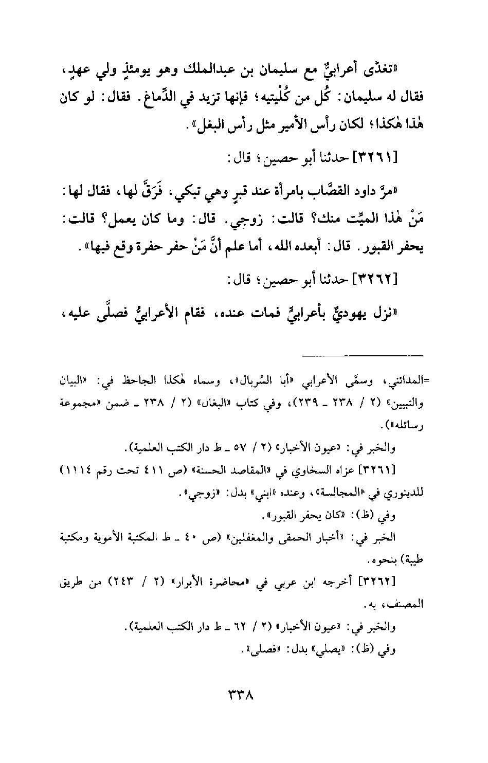 3261 - حَدَّثَنَا أَبُو حُصَيْنٍ؛ قَالَ: مَرَّ دَاوُدُ الْقَصَّابُ بِامْرَأَةٍ عِنْدَ قَبْرٍ وَهِيَ تَبْكِي، فَرَقَّ لَهَا، فَقَالَ لَهَا: مَنْ هَذَا الْمَيِّتُ مِنْكِ؟ قَالَتْ: زَوْجِي. قَالَ: وَمَا كَانَ يَعْمَلُ؟ قَالَتْ: يَحْفُرُ الْقُبُورَ. قَالَ: أَبْعَدَهُ اللهُ، أَمَا عَلِمَ أَنَّ مَنْ حَفَرَ حُفْرَةً وَقَعَ فِيهَا.