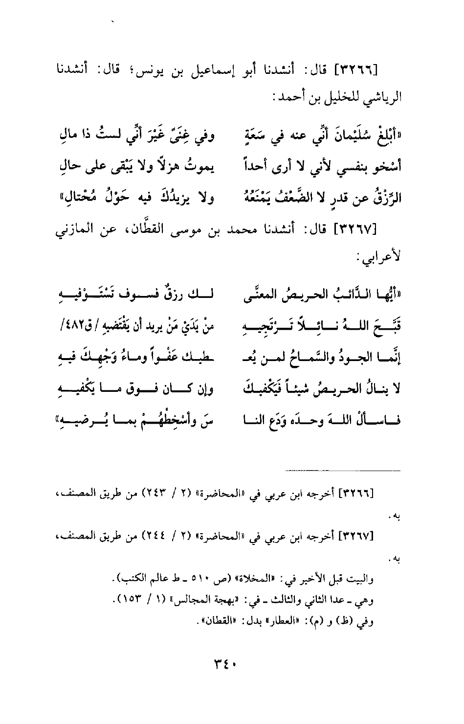 3266 - قَالَ: أَنْشَدَنَا أَبُو إِسْمَاعِيلَ بْنُ يُونُسَ؛ قَالَ: أَنْشَدَنَا الرِّيَاشِيُّ لِلْخَلِيلِ بْنِ أَحْمَدَ: