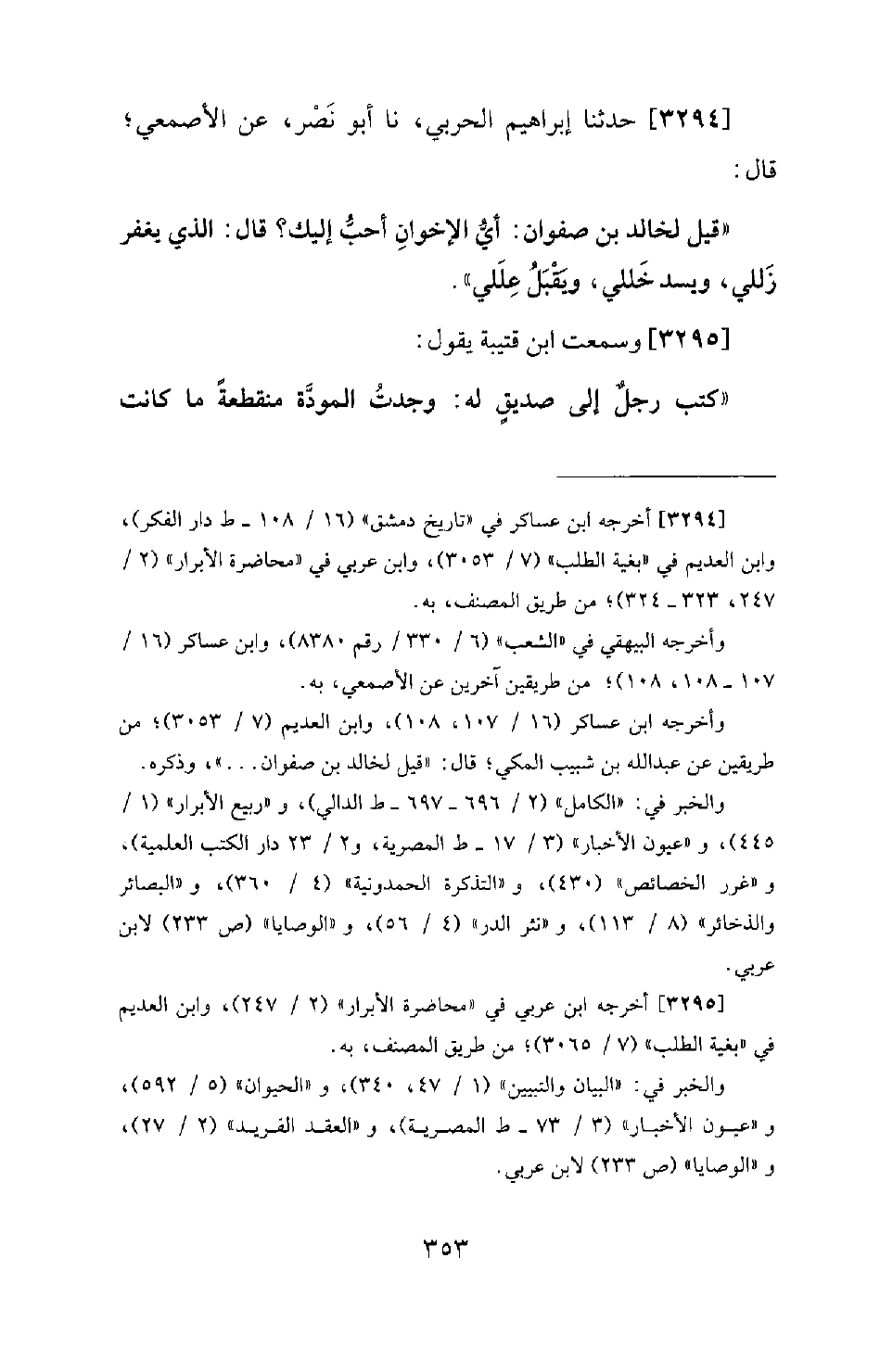 3294 - حَدَّثَنَا إِبْرَاهِيمُ الْحَرْبِيُّ، نا أَبُو نَصْرٍ، عَنِ الأَصْمَعِيِّ؛ قَالَ: قِيلَ لِخَالِدِ بْنِ صَفْوَانَ: أَيُّ الإِخْوَانِ أَحَبُّ إِلَيْكَ؟ قَالَ: الَّذِي يَغْفِرُ زَلَلِي، وَيَسُدُّ خَلَلِي، وَيَقْبَلُ عِلَلِي.