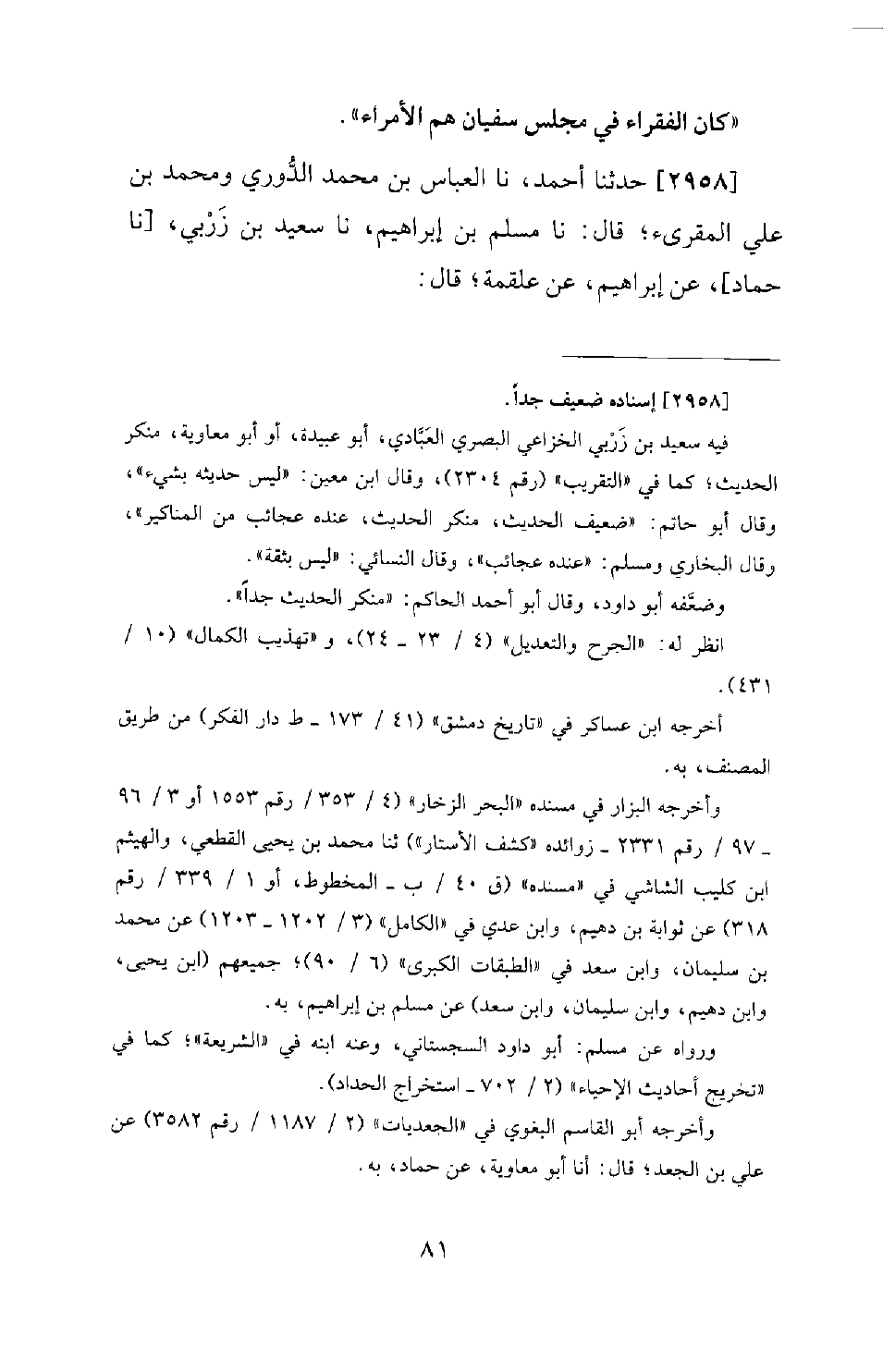 2958 - حَدَّثَنَا أَحْمَدُ، نا الْعَبَّاسُ بْنُ مُحَمَّدٍ الدُّورِيُّ وَمُحَمَّدُ بْنُ علي المقرئ؛ قالا: نا مُسْلِمُ بْنُ إِبْرَاهِيمَ، نا سَعِيدُ بْنُ زَرْبِيٍّ، [نا حَمَّادٌ] ، عَنْ إِبْرَاهِيمَ، عَنْ عَلْقَمَةَ؛ قَالَ: -[84]- كُنْتُ رَجُلا قَدْ أَعْطَانِيَ اللهُ عَزَّ وَجَلَّ حُسْنَ الصَّوْتِ بِالْقُرْآنِ، وَكَانَ عَبْدُ اللهِ بْنُ مَسْعُودٍ يَسْتَقْرِئُنِي وَيَقُولُ: اقْرَأْ فِدَاكَ أَبِي وَأُمِّي. قَالَ: سَمِعْتُ رَسُولَ اللهِ صَلَّى اللَّهُ عَلَيْهِ وَسَلَّمَ يَقُولُ: «إِنَّ حُسْنَ الصَّوْتِ يُزَيِّنُ الْقُرْآنَ»