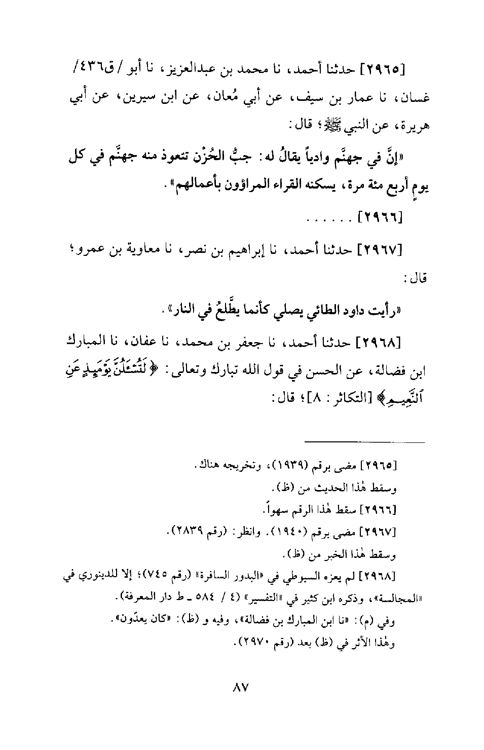 2965 - حَدَّثَنَا أَحْمَدُ، نا مُحَمَّدُ بْنُ عَبْدِ الْعَزِيزِ، نا أَبُو غَسَّانَ، نا عَمَّارُ بْنُ سَيْفٍ، عَنْ أَبِي مُعَانٍ، عَنِ ابْنِ سِيرِينَ، عَنْ أَبِي هُرَيْرَةَ، عَنِ النَّبِيِّ صَلَّى اللَّهُ عَلَيْهِ وَسَلَّمَ؛ قَالَ: «إِنَّ فِي جَهَنَّمَ وَادِيًا يُقَالُ لَهُ: جُبُّ الْحُزْنِ، تَتَعَوَّذُ مِنْهُ جَهَنَّمُ فِي كُلِّ يَوْمٍ أَرْبَعَمِائَةِ مَرَّةٍ، يَسْكُنُهُ القراء المراؤون بِأَعْمَالِهِمْ: