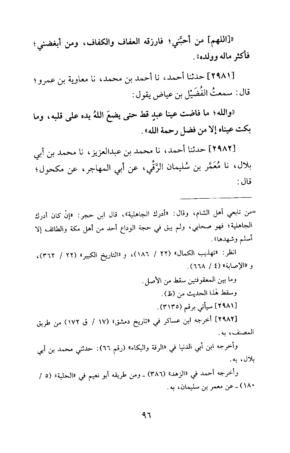 2981 - حَدَّثَنَا أَحْمَدُ، نا أَحْمَدُ بْنُ مُحَمَّدٍ، نا مُعَاوِيَةُ بْنُ عَمْرٍو؛ قَالَ: سَمِعْتُ الْفُضَيْلَ بْنَ عِيَاضٍ يَقُولُ: وَاللهِ! مَا فَاضَتْ عَيْنَا عَبْدٍ قَطُّ حَتَّى يَضَعَ اللهُ يَدَهُ عَلَى قَلْبِهِ، وَمَا بَكَتْ عَيْنَاهُ إِلا مِنْ فَضْلِ رَحْمَةِ اللهِ.
