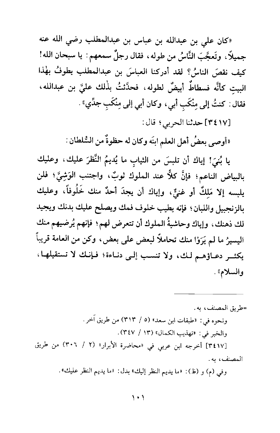 3417 - حَدَّثَنَا الْحَرْبِيُّ؛ قَالَ: أَوْصَى بَعْضُ أَهْلِ الْعِلْمِ ابْنَهُ وَكَانَ لَهُ حَظْوَةٌ مِنَ السُّلْطَانِ: يَا بُنَيَّ! إِيَّاكَ أَنْ تَلْبَسَ مِنَ الثِّيَابِ مَا يُدِيمُ النَّظَرَ عَلَيْكَ، وَعَلَيْكَ بِالْبَيَاضِ النَّاعِمِ؛ فَإِنَّ كُلا عِنْدَ الْمُلُوكِ ثَوْبٌ، وَاجْتَنِبِ الْوَشِيَّ؛ فَلَنْ يَلْبَسَهُ إِلا مَلِكٌ أَوْ غَنِيٌّ، وَإِيَّاكَ أَنْ يَجدَ أَحَدٌ مِنْكَ خَلُوفًا، وَعَلَيْكَ بِالزَّنْجَبِيلِ وَاللِّبَانِ؛ فَإِنَّهُ يُطَيِّبُ خُلُوفَ فَمِكَ وَيُصْلِحُ عَلَيْكَ بَدَنَكَ وَيُجِيدُ لَكَ ذِهْنَكَ، وَإِيَّاكَ وَحَاشِيَةَ الْمُلُوكِ أَنْ تَتَعَرَّضَ لَهُمْ؛ فَإِنَّهُمْ يُرْضِيهِمْ مِنْكَ الْيَسِيرُ مَا لَمْ يَرَوْا مِنْكَ تَحَامُلا لِبَعْضٍ عَلَى بَعْضٍ، وَكُنْ مِنَ الْعَامَّةِ قَرِيبًا يَكْثُرُ دُعَاؤُهُمْ لَكَ، وَلا تُنْسَبُ إِلَى دَنَاءَةٍ؛ فَإِنَّكَ لا تَسْتَقِيلُهَا، وَالسَّلامُ.