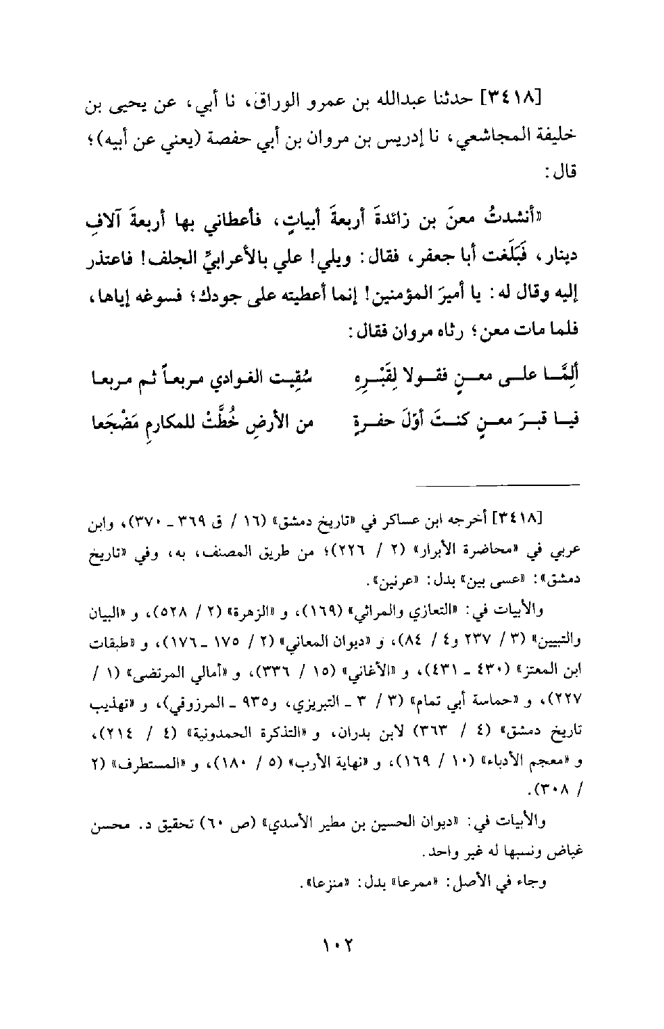 3418 - حَدَّثَنَا عَبْدُ اللهِ بْنُ عَمْرٍو الْوَرَّاقُ، نا أَبِي، عَنْ يَحْيَى بْنِ خَلِيفَةَ الْمُجَاشِعِيِّ، نا إِدْرِيسُ بْنُ مَرْوَانَ بْنِ أَبِي حَفْصَةَ (يَعْنِي عَنْ أَبِيهِ) ؛ قَالَ: أَنْشَدْتُ مَعْنَ بْنَ زَائِدَةَ أَرْبَعَةَ أَبْيَاتٍ، فَأَعْطَانِي بِهَا أَرْبَعَةَ آلافِ دِينَارٍ، فَبَلَغْتُ أَبَا جَعْفَرٍ، فَقَالَ: وَيْلِي! عَلَيَّ بِالأَعْرَابِيِّ الْجِلْفِ! فَاعْتَذَرَ إِلَيْهِ وَقَالَ لَهُ: يَا أَمِيرَ الْمُؤْمِنِينَ! إِنَّمَا أَعْطَيْتَهُ عَلَى جُودِكَ؛ فَسَوِّغْهُ إِيَّاهَا، فَلَمَّا مَاتَ مَعْنٌ؛ رَثَاهُ مَرْوَانُ فَقَالَ: