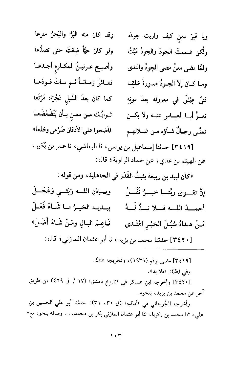 3419 - حَدَّثَنَا إِسْمَاعِيلُ بْنُ يُونُسَ، نا الرِّيَاشِيُّ، نا عُمَرُ بْنُ بُكَيْرٍ، عَنِ الْهَيْثَمِ بْنِ عَدِيٍّ، عَنْ حَمَّادٍ الرَّاوِيَةِ؛ قَالَ: كَانَ لَبِيدُ بْنُ رَبِيعَةَ يُثْبِتُ الْقَدَرَ فِي الْجَاهِلِيَّةِ، وَمِنْ قَوْلِهِ: