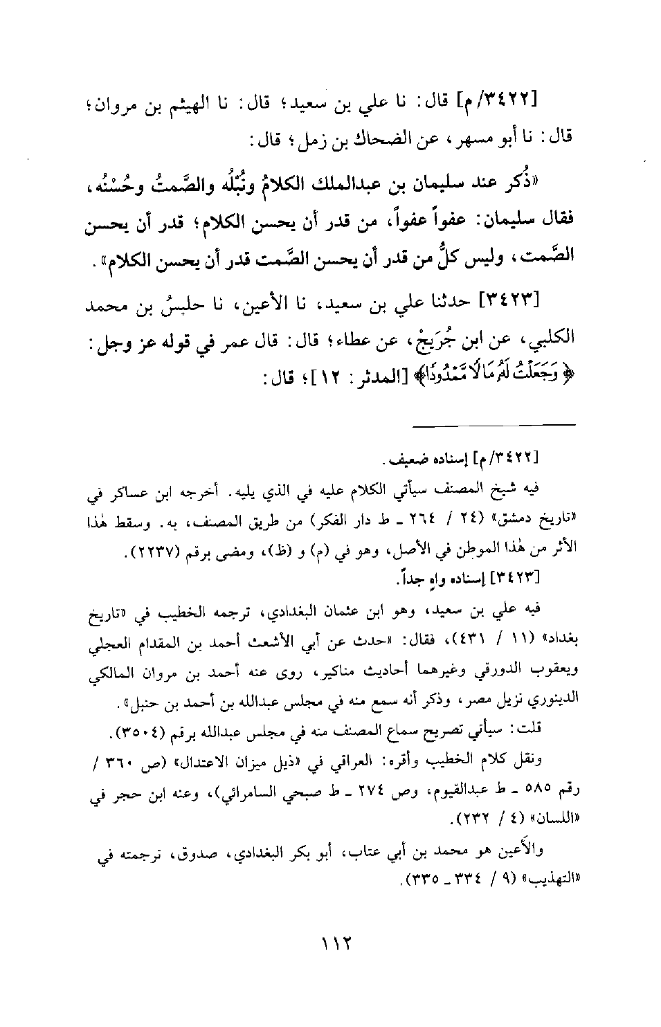 3422 - / م - قَالَ: نا عَلِيُّ بْنُ سَعِيدٍ؛ قَالَ: نا الْهَيْثَمُ بْنُ مَرْوَانَ؛ قَالَ: نا أَبُو مُسْهِرٍ، عَنِ الضَّحَّاكِ بْنِ زِمْلٍ؛ قَالَ: ذُكِرَ عِنْدَ سُلَيْمَانَ بْنِ عَبْدِ الْمَلِكِ الْكَلامُ وَنُبْلُهُ وَالصَّمْتُ وَحُسْنُهُ، فَقَالَ سُلَيْمَانُ: عَفْوًا عَفْوًا، مَنْ قَدِرَ أَنْ يُحْسِنَ الْكَلامَ؛ قَدْرَ أَنْ يُحْسِنَ الصَّمْتَ، وَلَيْسَ كُلُّ مَنْ قَدِرَ أَنْ يُحْسِنَ الصَّمْتَ قَدْرَ أَنْ يُحْسِنَ الْكَلامَ