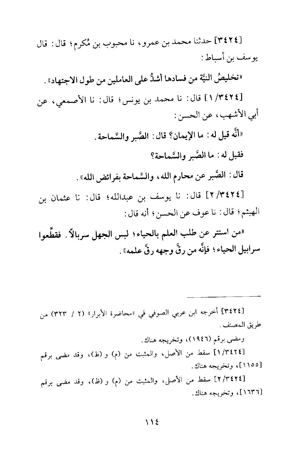 3424 - / 2 م - قَالَ: نا يُوسُفُ بْنُ عَبْدِ اللهِ؛ قَالَ: نا عُثْمَانُ بْنُ الْهَيْثَمِ؛ قَالَ: نا عوف، عن الْحَسَنِ؛ أَنَّهُ قَالَ: مَنِ اسْتَتَرَ عَنْ طَلَبِ الْعِلْمِ بالحياء؛ لبس الجهل سِرْبَالا. فَقَطِّعُوا سَرَابِيلَ الْحَيَاءِ؛ فَإِنَّهُ مَنْ رَقَّ وَجْهُهُ رق علمه.