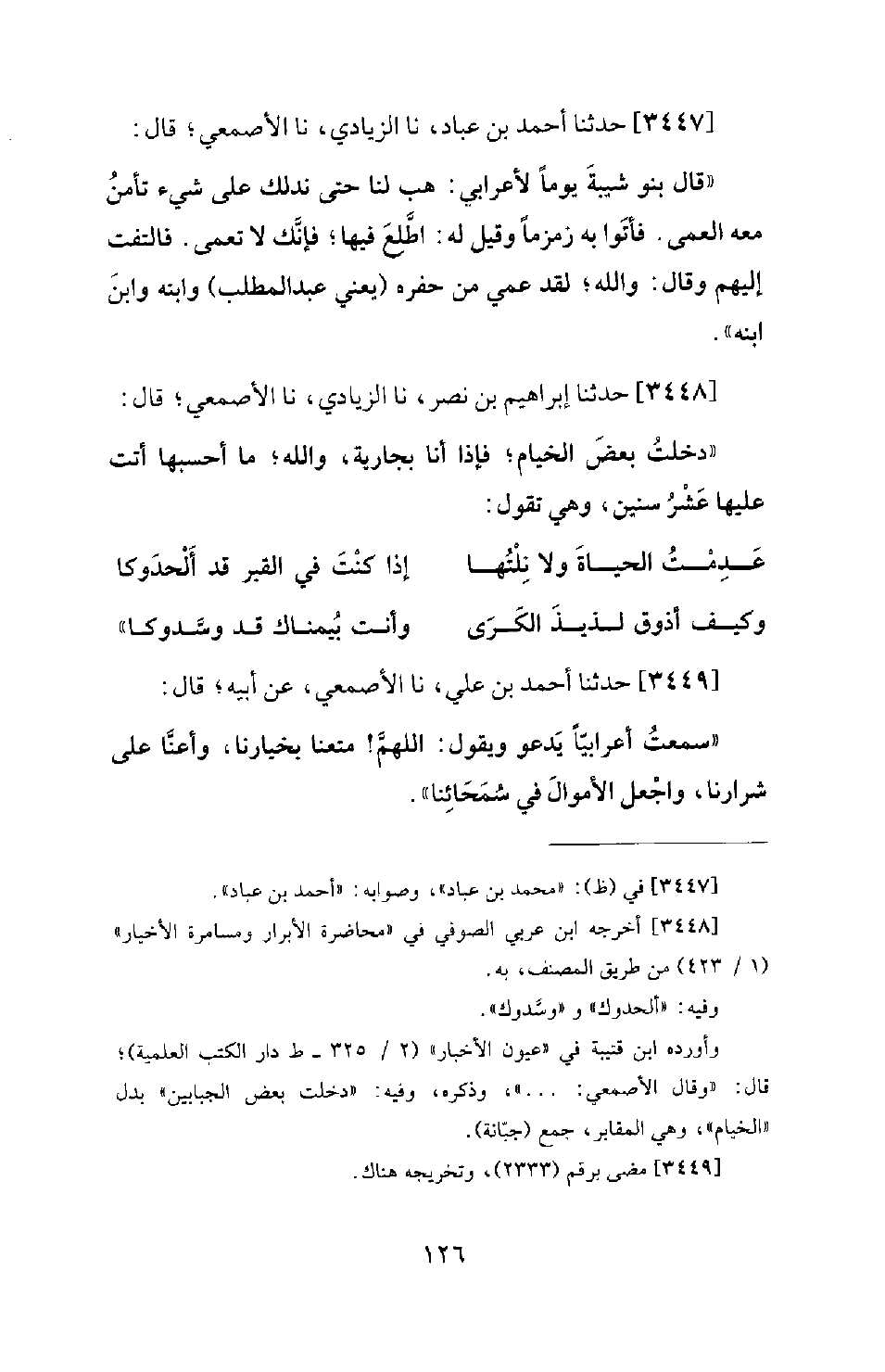 3447 - حَدَّثَنَا أَحْمَدُ بْنُ عَبَّادٍ، نا الزِّيَادِيُّ، نا الأَصْمَعِيُّ؛ قَالَ: قَالَ بَنُو شَيْبَةَ يَوْمًا لأَعْرَابِيٍّ: هَبْ لَنَا حَتَّى نَدُلَّكَ عَلَى شَيْءٍ تَأْمَنُ مَعَهُ الْعَمَى. فَأَتَوْا بِهِ زَمْزَمًا وَقِيلَ لَهُ: اطَّلِعْ فِيهَا؛ فَإِنَّكَ لا تَعْمَى. فَالْتَفَتَ إِلَيْهِمْ وَقَالَ: وَاللهِ! لَقَدْ عَمِيَ مَنْ حَفَرَهُ (يَعْنِي عَبْدَ الْمُطَّلِبِ) وَابْنَهُ وَابْنَ ابْنِهِ.