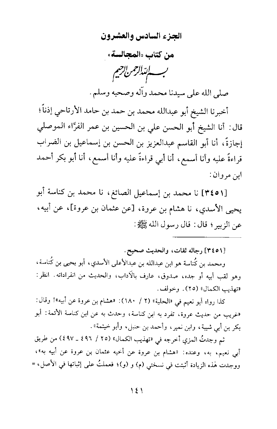 3451 - نا مُحَمَّدُ بْنُ إِسْمَاعِيلَ الصَّائِغُ، نا مُحَمَّدُ بْنُ كُنَاسَةَ أَبُو يَحْيَى الأَسَدِيُّ، نا هِشَامُ بْنُ عُرْوَةَ، [عَنْ عُثْمَانَ بْنِ عُرْوَةَ] ، عَنْ أَبِيهِ، عَنِ الزُّبَيْرِ؛ قَالَ: قَالَ رَسُولُ اللهِ -[142]- صَلَّى اللَّهُ عَلَيْهِ وَسَلَّمَ: «غَيِّرُوا الشَّيْبَ وَلا تَشَبَّهُوا بِالْيَهُودِ»