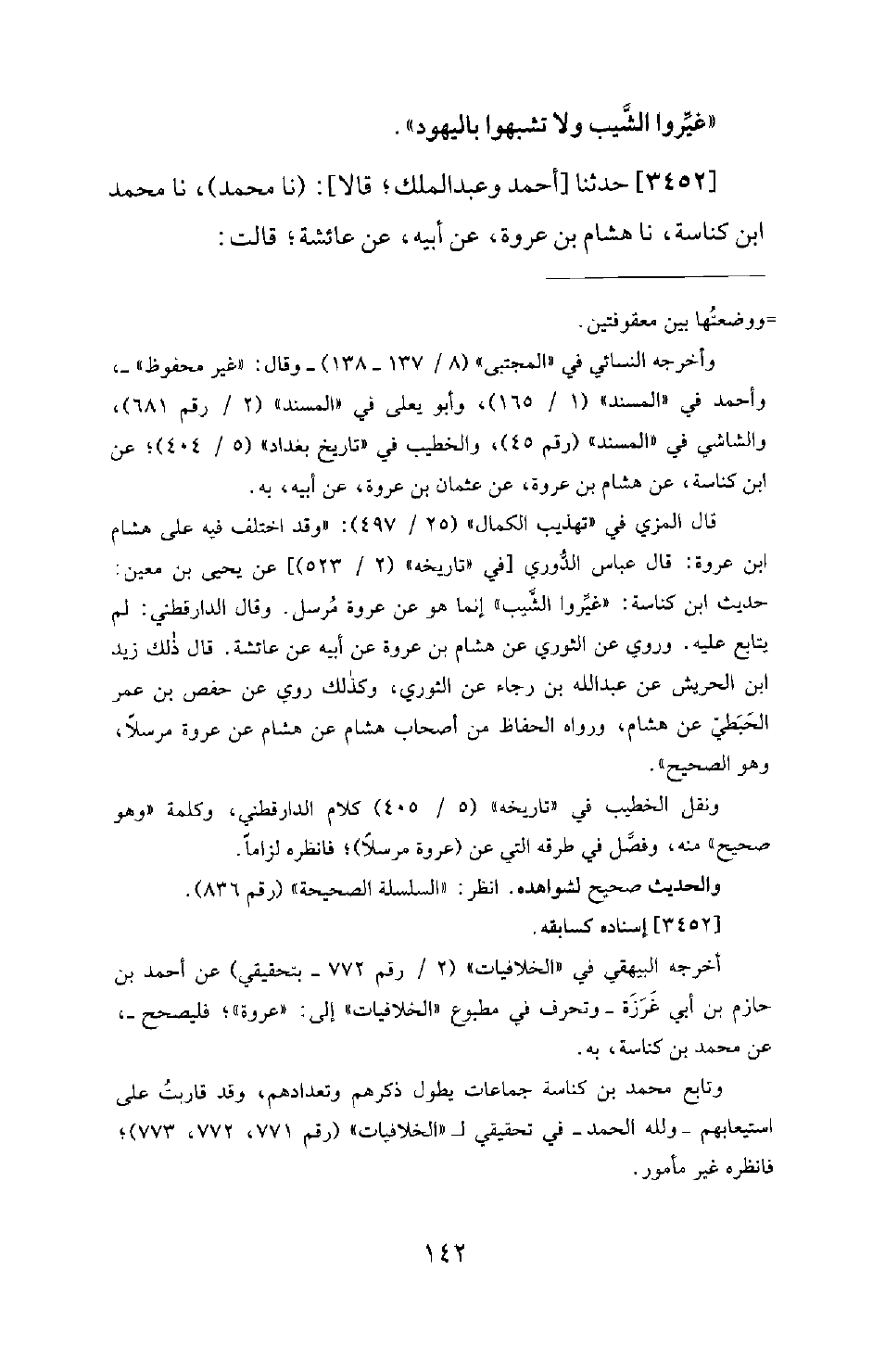3452 - حَدَّثَنَا أَحْمَدُ وَعَبْدُ الْمَلِكِ؛ قَالا: نا مُحَمَّدُ، نا مُحَمَّدُ بْنُ كُنَاسَةَ، نا هِشَامُ بْنُ عُرْوَةَ، عَنْ أَبِيهِ، عَنْ عَائِشَةَ؛ قَالَتْ: -[143]- كَانَ رَسُولُ اللهِ صَلَّى اللَّهُ عَلَيْهِ وَسَلَّمَ يَبْدَأُ بِغَسْلِ يَدَيْهِ مِنَ الْجَنَابَةِ، ثُمَّ يَتَوَضَّأُ وُضُوءَهُ لِلصَّلاةِ