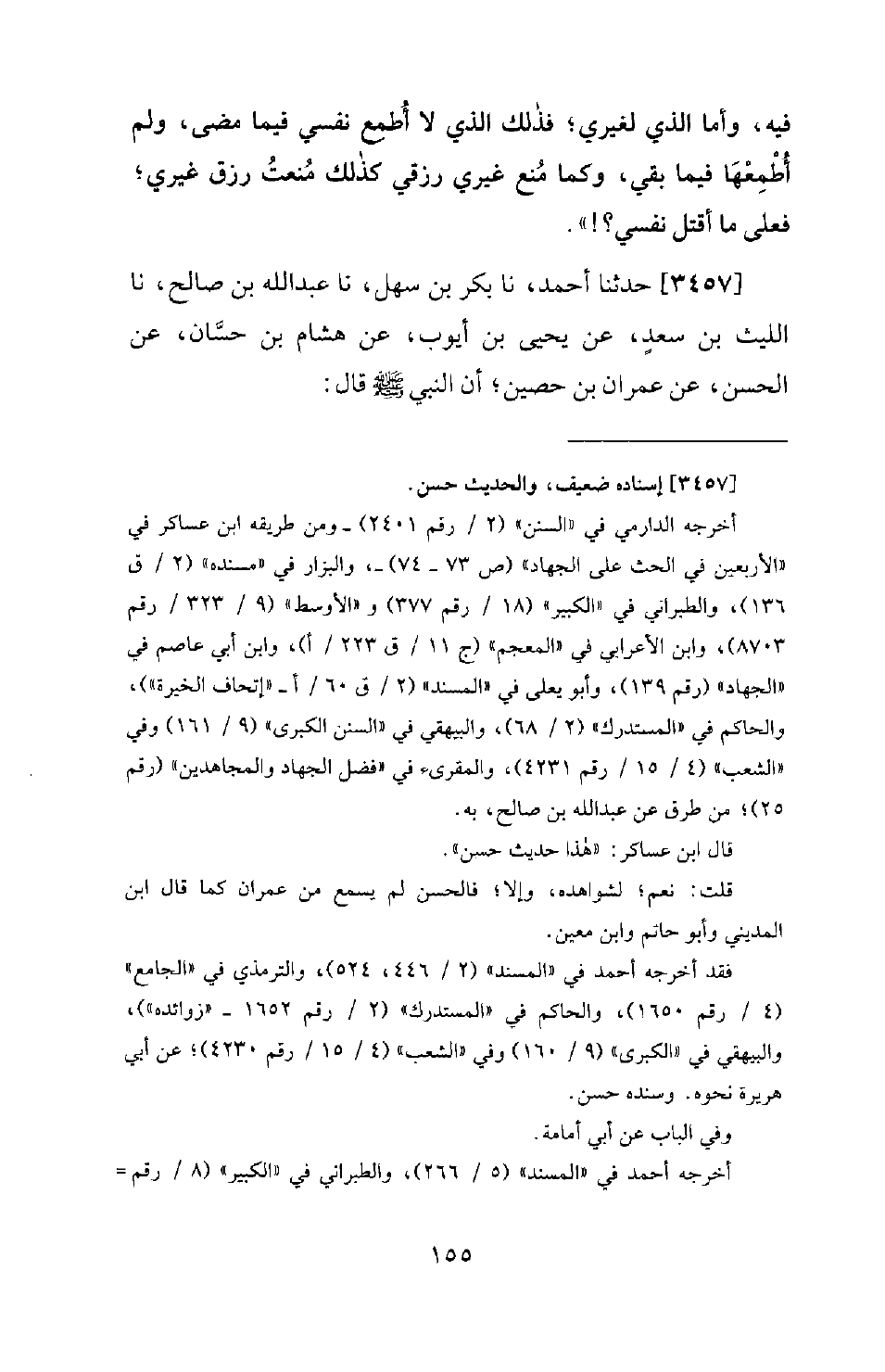 3457 - حَدَّثَنَا أَحْمَدُ، نا بَكْرُ بْنُ سَهْلٍ، نا عَبْدُ اللهِ بْنُ صَالِحٍ، نا اللَّيْثُ بْنُ سَعْدٍ، عَنْ يَحْيَى بْنِ أَيُّوبَ، عَنْ هِشَامِ بْنِ حَسَّانٍ، عَنِ الْحَسَنِ، عَنْ عِمْرَانَ بْنِ حُصَيْنٍ؛ أَنَّ النَّبِيَّ صَلَّى اللَّهُ عَلَيْهِ وَسَلَّمَ قَالَ -[156]-: «مَقَامُ الرَّجُلِ فِي الصَّفِّ فِي سَبِيلِ اللهِ أَفْضَلُ مِنْ عِبَادَةِ رَجُلٍ سِتِّينَ سَنَةً»