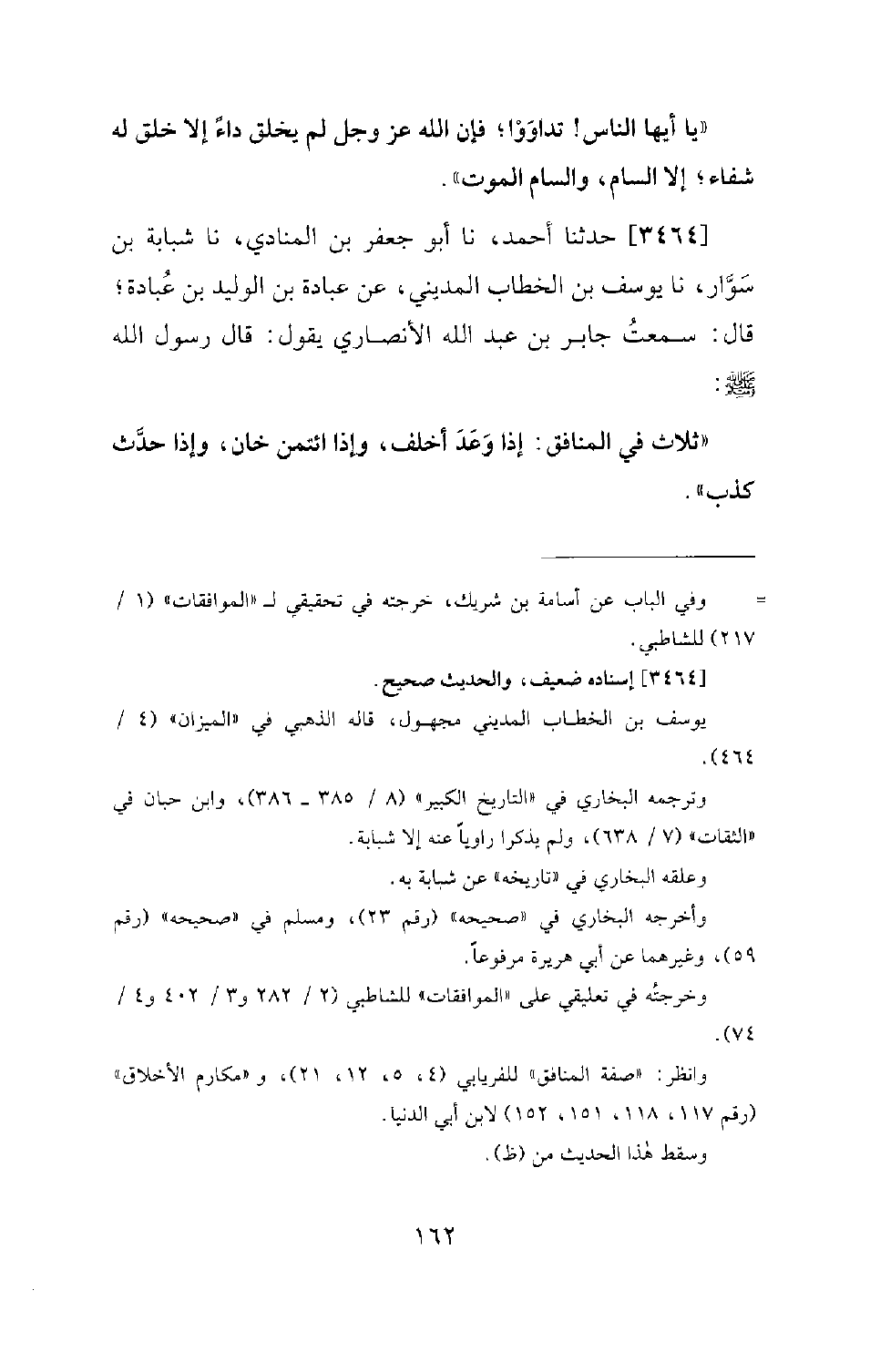 3464 - حَدَّثَنَا أَحْمَدُ، نا أَبُو جَعْفَرِ بْنِ الْمُنَادِي، نا شَبَابَةُ بْنُ سَوَّارٍ، نا يُوسُفُ بْنُ الْخَطَّابِ الْمَدِينِيُّ، عَنْ عُبَادَةَ بْنِ الْوَلِيدِ بْنِ عُبَادَةَ؛ قَالَ: سَمِعْتُ جَابِرَ بْنَ عَبْدِ اللهِ الأَنْصَارِيَّ يَقُولُ: قَالَ رَسُولُ اللهِ صَلَّى اللَّهُ عَلَيْهِ وَسَلَّمَ: «ثَلاثٌ فِي الْمُنَافِقِ: إِذَا وَعَدَ أَخْلَفَ، وَإِذَا ائْتُمِنَ خَانَ، وَإِذَا حَدَّثَ كَذَبَ»