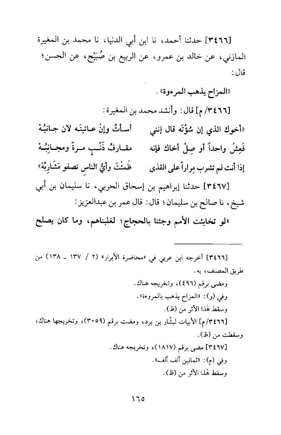 3466 - حَدَّثَنَا أَحْمَدُ، نا ابْنُ أَبِي الدُّنْيَا، نا مُحَمَّدُ بْنُ الْمُغِيرَةِ الْمَازِنِيُّ، عَنْ خَالِدِ بْنِ عَمْرٍو، عَنِ الرَّبِيعِ بْنِ صُبَيْحٍ، عَنِ الْحَسَنِ؛ قَالَ: الْمُزَاحُ يُذْهِبُ الْمُرُوءة.