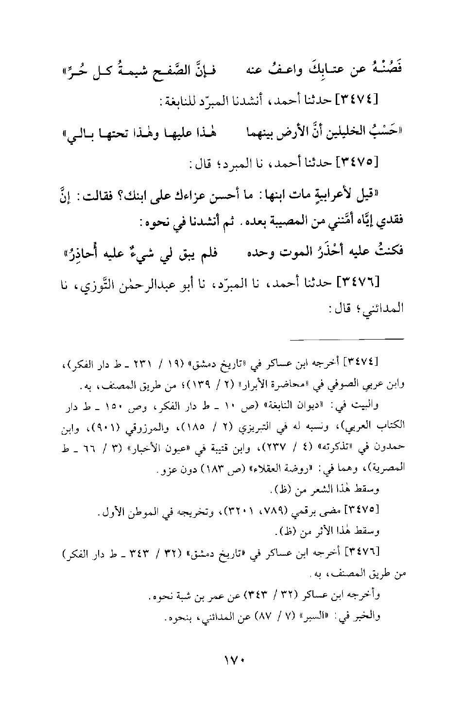 3475 - حَدَّثَنَا، أَحْمَدُ، نا الْمُبَرِّدُ؛ قَالَ: قِيلَ لأَعْرَابِيَّةٍ مَاتَ ابْنُهَا: مَا أَحْسَنُ عَزَاءَكِ عَلَى ابْنِكِ؟ فَقالَتْ: إِنَّ فَقْدِي إِيَّاهُ أَمَّنَنِي مِنَ الْمُصِيبَةِ بَعْدَهُ. ثُمَّ أَنْشَدَنَا فِي نَحْوِهِ: