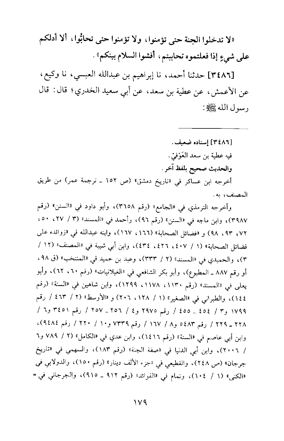 3486 - حَدَّثَنَا أَحْمَدُ، نا إِبْرَاهِيمُ بْنُ عَبْدِ اللهِ الْعَبْسِيُّ، نا وَكِيعٌ، عَنِ الأَعْمَشِ، عَنْ عَطِيَّةَ بْنِ سَعْدٍ، عَنْ أَبِي سَعِيدٍ الْخُدْرِيِّ؛ قَالَ: قَالَ رَسُولُ اللهِ -[182]- صَلَّى اللَّهُ عَلَيْهِ وَسَلَّمَ: «إِنَّ أَهْلَ الدَّرَجَاتِ الْعُلَى لَيَتَرَاءَوْنَ مَنْ أَسْفَلُ مِنْهُمْ كَمَا تَرَوْنَ الْكَوْكَبَ الطَّالِعَ فِي الأُفُقِ مِنْ آفَاقِ السَّمَاءِ، وَإِنَّ أَبَا بَكْرٍ وَعُمَرَ مِنْهُمْ وَأَنْعَمَا»