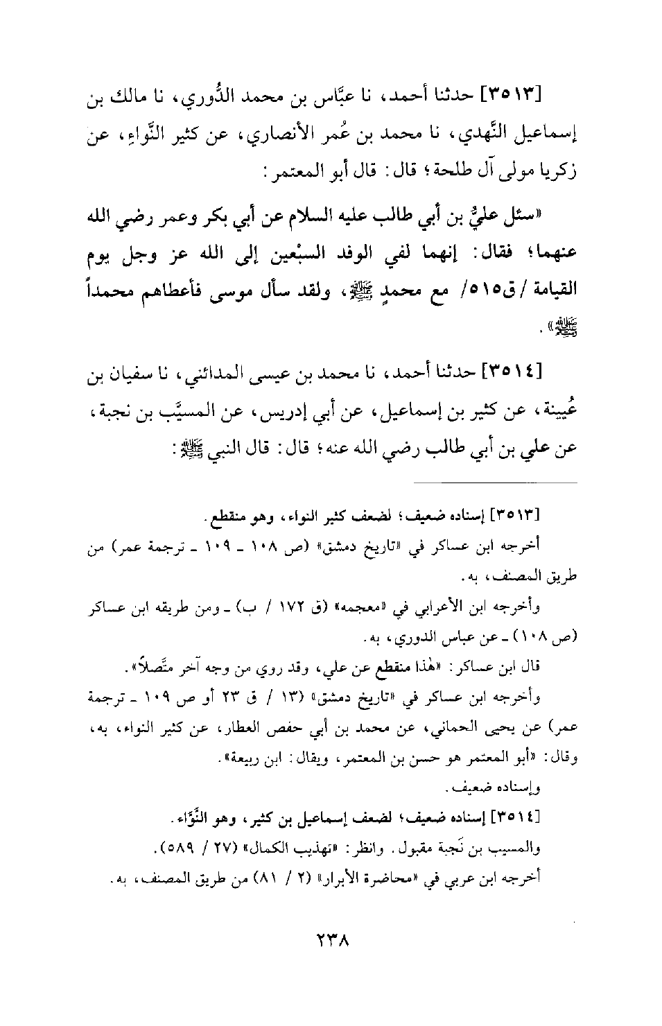 3513 - حَدَّثَنَا أَحْمَدُ، نا عَبَّاسُ بْنُ مُحَمَّدٍ الدُّورِيُّ، نا مَالِكُ بْنُ إِسْمَاعِيلَ النَّهْدِيُّ، نا مُحَمَّدُ بْنُ عُمَرَ الأَنْصَارِيُّ، عَنْ كَثِيرٍ النَّوَاءِ، عَنْ زَكَرِيَّا مَوْلَى آلِ طَلْحَةَ؛ قَالَ: قال أَبُو الْمُعْتَمِرِ: سُئِلَ عَلِيُّ بْنُ أَبِي طَالِبٍ عَلَيْهِ السَّلامُ عَنْ أَبِي بَكْرٍ وَعُمَرَ رَضِيَ اللهُ عَنْهُمَا؛ فَقَالَ: إِنَّهُمَا لَفِي الْوَفْدِ السَّبْعِينَ إِلَى اللهِ عَزَّ وَجَلَّ يَوْمَ الْقِيَامَةِ مَعَ مُحَمَّدٍ صَلَّى اللَّهُ عَلَيْهِ وَسَلَّمَ، وَلَقَدْ سَأَلَ مُوسَى فَأَعْطَاهُمْ مُحَمَّدًا صَلَّى اللَّهُ عَلَيْهِ وَسَلَّمَ