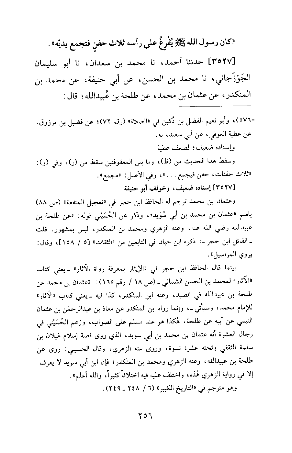 3527 - حَدَّثَنَا أَحْمَدُ، نا مُحَمَّدُ بْنُ سَعْدَانَ، نا أَبُو سُلَيْمَانَ الْجَوْزَجَانِيُّ، نا مُحَمَّدُ بْنُ الْحَسَنِ، عَنْ أَبِي حَنِيفَةَ، عَنْ مُحَمَّدِ بْنِ الْمُنْكَدِرِ، عَنْ عُثْمَانَ بْنِ مُحَمَّدٍ، عَنْ طَلْحَةَ بْنِ عُبَيْدِ اللهِ؛ قَالَ: -[258]- تَذَاكَرْنَا لَحْمَ الصَّيْدِ يَأْكُلُهُ الْمُحْرِمُ وَالنَّبِيُّ صَلَّى اللَّهُ عَلَيْهِ وَسَلَّمَ نائم، وارتفعت أصواتنا، فاستيقظ رَسُولُ اللهِ صَلَّى اللَّهُ عَلَيْهِ وَسَلَّمَ، فَقَالَ: «فِيمَ تَتَنَازَعُونَ؟» قُلْنَا: فِي لَحْمِ صَيْدٍ يَأْكُلُهُ الْمُحْرِمُ. فَأَمَرَنَا بِأَكْلِهِ