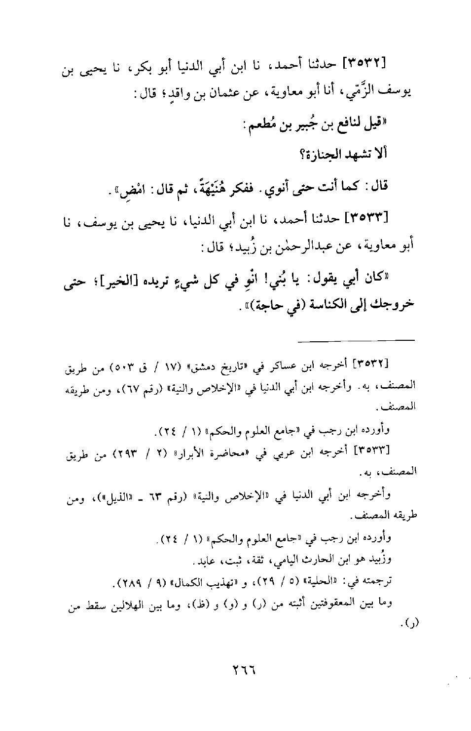 3532 - حَدَّثَنَا أَحْمَدُ، نا ابْنُ أَبِي الدُّنْيَا أَبُو بَكْرٍ، نا يَحْيَى بْنُ يُوسُفَ الزَّمِّيُّ، أنا أَبُو مُعَاوِيَةَ، عَنْ عُثْمَانَ بْنِ وَاقِدٍ؛ قَالَ: قِيلَ لِنَافِعِ بْنِ جُبَيْرِ بْنِ مُطْعَمٍ: أَلا تَشْهَدُ الْجِنَازَةَ؟ قَالَ: كَمَا أَنْتَ حَتَّى أَنْوِيَ. فَفَكَّرَ هُنَيْهَةً، ثُمَّ قَالَ: امْضِ.