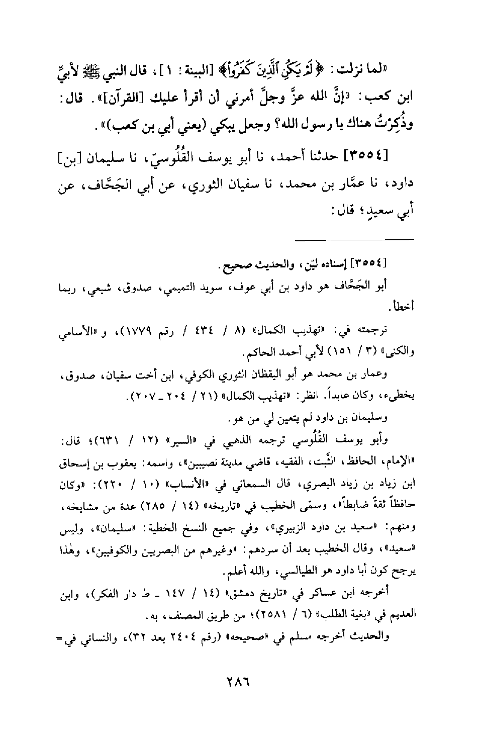 3554 - حَدَّثَنَا أَحْمَدُ، نا أَبُو يُوسُفَ الْقُلُوسِيُّ، نا سُلَيْمَانُ بْنُ دَاوُدَ، نا عَمَّارُ بْنُ مُحَمَّدٍ، نا سُفْيَانُ الثَّوْرِيُّ، عَنْ أَبِي الْجَحَّافِ، عَنْ أَبِي سَعِيدٍ؛ قَالَ: -[287]- نَزَلَتْ: {إِنَّمَا يُرِيدُ اللهُ لِيُذْهِبَ عَنْكُمُ الرجس أهل البيت} [الأحزاب: 33] فِي خَمْسَةٍ: فِي رَسُولِ اللهِ صَلَّى اللَّهُ عَلَيْهِ وَسَلَّمَ، وَعَلِيٍّ، وَفَاطِمَةَ، وَالْحَسَنِ، وَالْحُسَيْنِ، رِضْوَانُ اللهِ عَلَيْهِمْ أَجْمَعِينَ