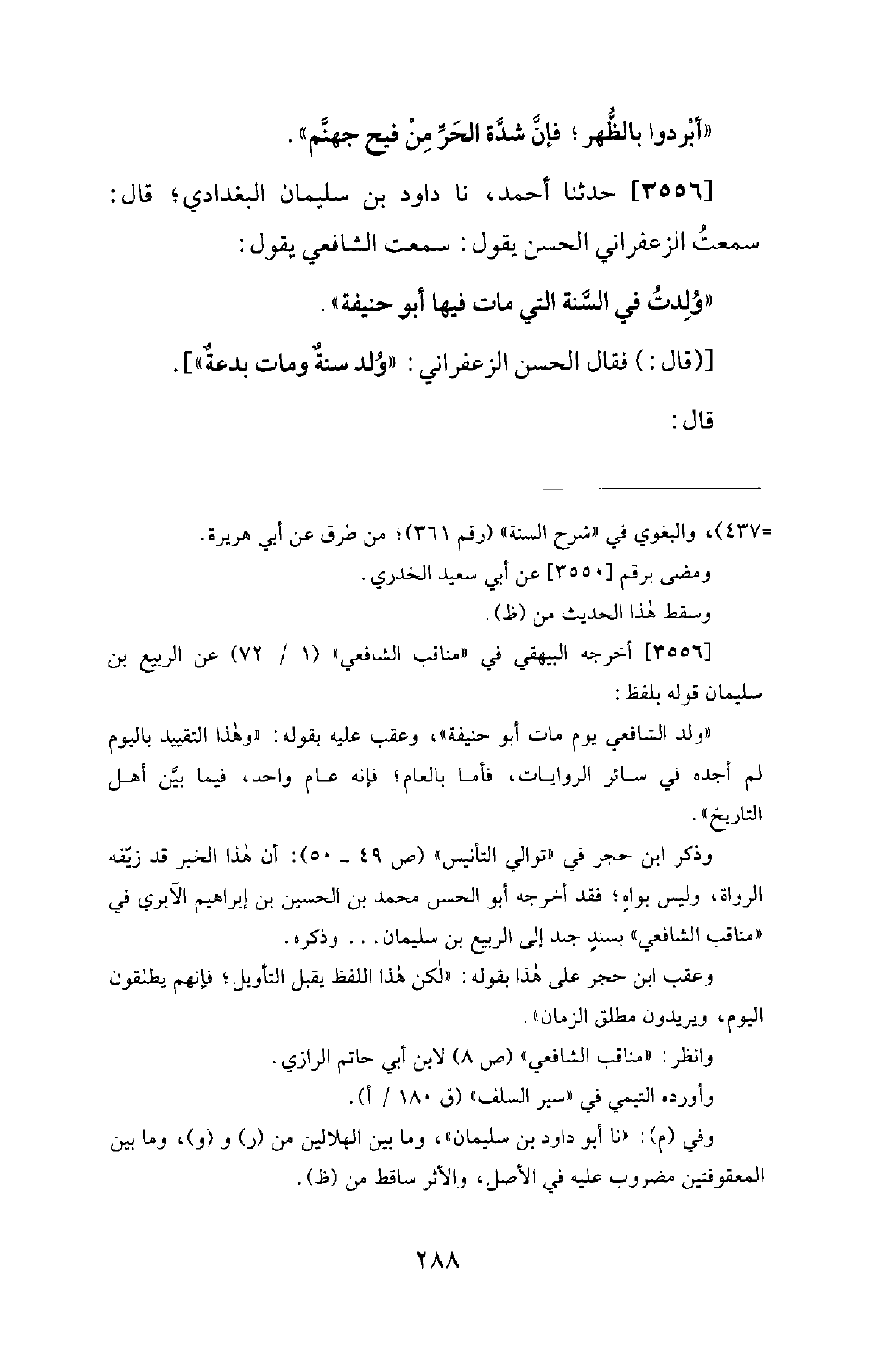 3556 - حَدَّثَنَا أَحْمَدُ، نا دَاوُدُ بْنُ سُلَيْمَانَ الْبَغْدَادِيُّ؛ قَالَ: سَمِعْتُ الزَّعْفَرَانِيَّ الْحَسَنَ يَقُولُ: سَمِعْتُ الشَّافِعِيَّ يَقُولُ: وُلِدْتُ فِي السَّنَةِ الَّتِي مَاتَ فِيهَا أَبُو حَنِيفَةَ. قَالَ: فَقَالَ الْحَسَنُ الزَّعْفَرَانِيُّ: وُلِدَ سُنَّةٌ وَمَاتَ بِدْعَةٌ