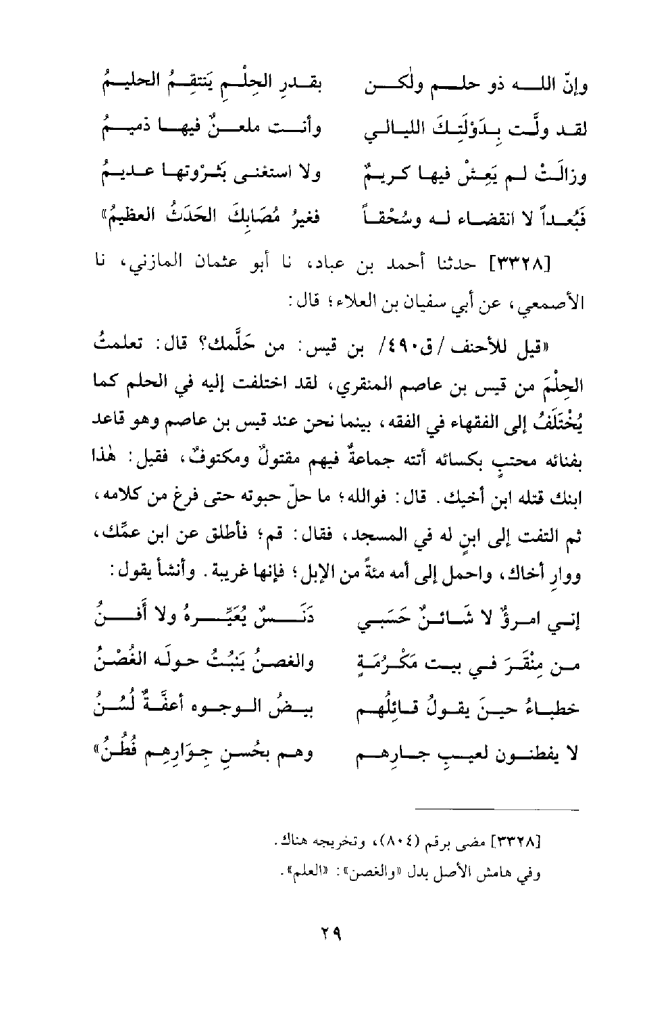 3328 - حَدَّثَنَا أَحْمَدُ بْنُ عَبَّادٍ، نا أَبُو عُثْمَانَ الْمَازِنِيُّ، نا الأَصْمَعِيُّ، عَنْ أَبِي سُفْيَانَ بْنِ الْعَلاءِ؛ قَالَ: قِيلَ لِلأَحْنَفِ بْنِ قَيْسٍ: مَنْ حَلَّمَكَ؟ قَالَ: تَعَلَّمْتُ الْحِلْمَ مِنْ قَيْسِ بْنِ عَاصِمٍ المنقري، لقد اختلفت إِلَيْهِ فِي الْحِلْمِ كَمَا يُخْتَلَفُ إِلَى الْفُقَهَاءِ فِي الْفِقْهِ، بَيْنَمَا نَحْنُ عِنْدَ قَيْسِ بْنِ عَاصِمٍ وَهُوَ قَاعِدٌ بِفِنَائِهِ مُحْتَبٍ بِكِسَائِهِ أَتَتْهُ جَمَاعَةٌ فِيهِمْ مَقْتُولٌ وَمَكْتُوفٌ، فَقِيلَ: هَذَا ابْنُكَ قَتَلَهُ ابْنُ أَخِيكَ. قَالَ: فَوَاللهِ! مَا حَلَّ حَبْوَتَهُ حَتَّى فَرَغَ مِنْ كَلامِهِ، ثُمَّ الْتَفَتَ إِلَى ابْنٍ لَهُ فِي الْمَسْجِدِ، فَقَالَ: قُمْ؛ فَأَطْلِقْ عَنِ ابْنِ عَمِّكَ، وَوَارِ أَخَاكَ، وَاحْمِلْ إلى أمه مئة مِنَ الإِبِلِ؛ فَإِنَّهَا غَرِيبَةٌ. وَأَنْشَأَ يَقُولُ:
