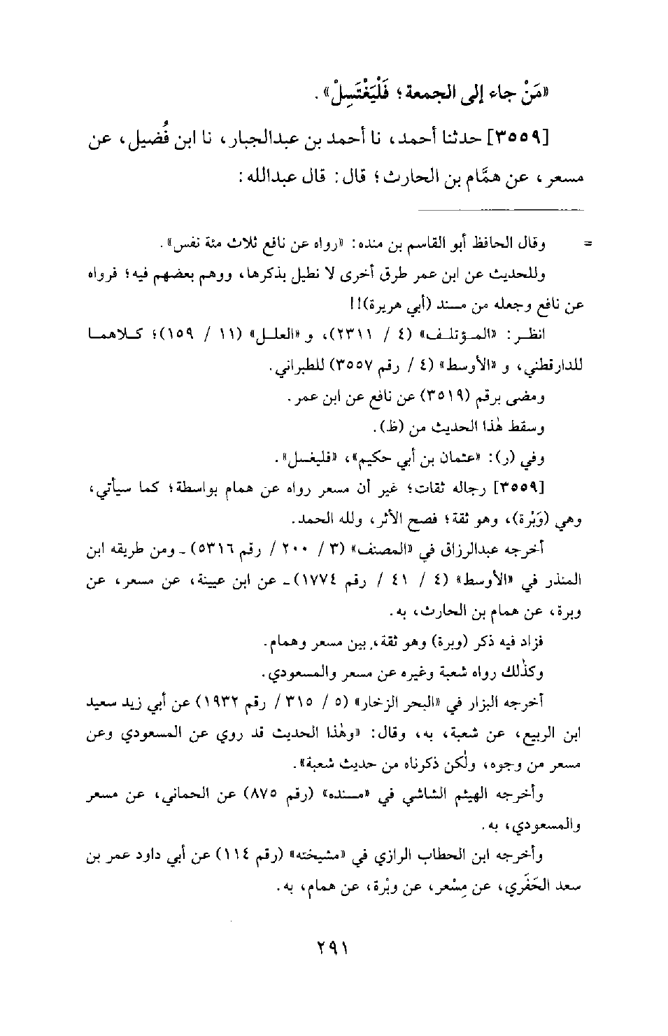 3559 - حَدَّثَنَا أَحْمَدُ، نا أَحْمَدُ بْنُ عَبْدِ الْجَبَّارِ، نا ابْنُ فُضَيْلٍ، عَنْ مِسْعَرٍ، عَنْ هَمَّامِ بْنِ الْحَارِثِ؛ قَالَ: قَالَ عَبْدُ اللهِ: -[292]- مِنَ السُّنَّةِ الْغُسْلُ يَوْمَ الْجُمُعَةِ [رجاله ثقات] .