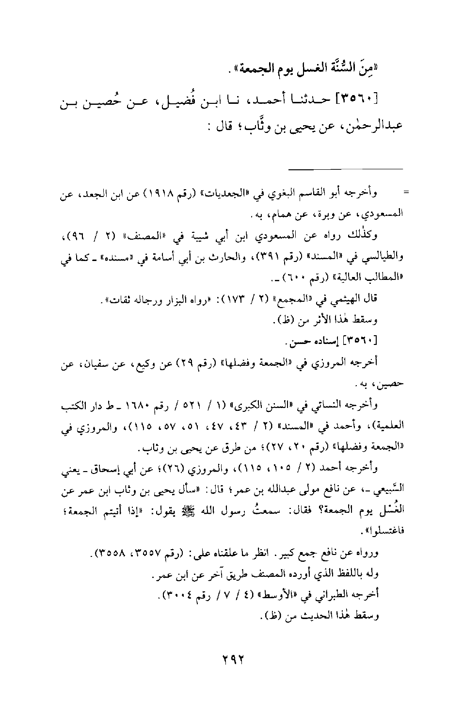 3560 - حَدَّثَنَا أَحْمَدُ، نا ابْنُ فُضَيْلٍ، عَنْ حُصَيْنِ بْنِ عَبْدِ الرَّحْمَنِ، عَنْ يَحْيَى بْنِ وَثَّابٍ؛ قَالَ: -[293]- سَأَلْتُ ابْنَ عُمَرَ عَنِ الاغْتِسَالِ يَوْمَ الْجُمُعَةِ، فَقَالَ: أَمَرَنَا رَسُولُ اللهِ صَلَّى اللَّهُ عَلَيْهِ وَسَلَّمَ أَنْ نَغْتَسِلَ يَوْمَ الْجُمُعَةِ