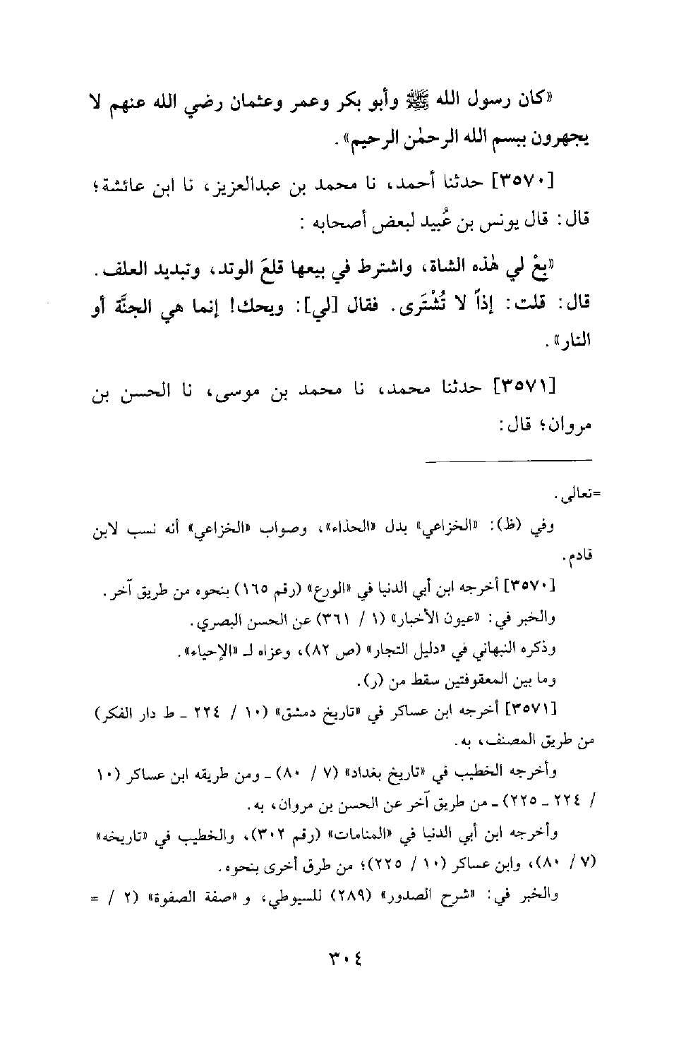 3570 - حَدَّثَنَا أَحْمَدُ، نا مُحَمَّدُ بْنُ عَبْدِ الْعَزِيزِ، نا ابْنُ عَائِشَةَ؛ قَالَ: قَالَ يُونُسُ بْنُ عُبَيْدٍ لِبَعْضِ أَصْحَابِهِ. بِعْ لِي هَذِهِ الشَّاةَ، وَاشْتَرَطَ فِي بَيْعِهَا قَلْعَ الْوَتَدِ، وَتَبْدِيدَ الْعَلَفِ. قَالَ: قُلْتُ: إِذًا لا تُشْتَرَى. فَقَالَ لِي: وَيْحَكَ! إِنَّمَا هِيَ الْجَنَّةُ أَوِ النَّارُ.