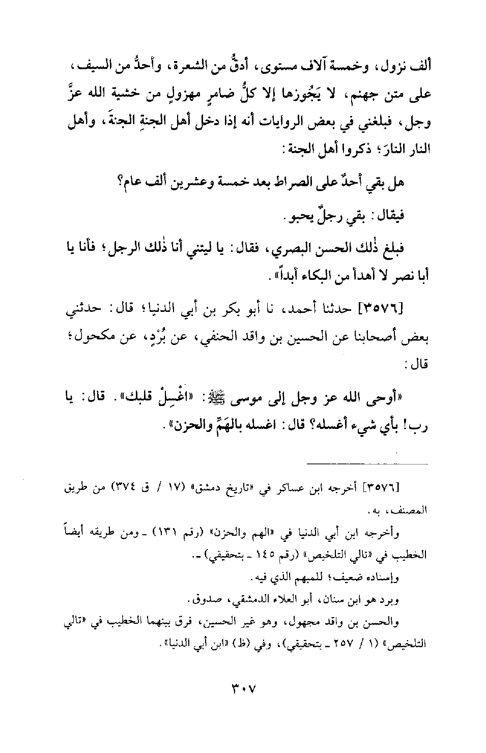 3576 - حَدَّثَنَا أَحْمَدُ، نا أَبُو بَكْرِ بْنُ أَبِي الدُّنْيَا؛ قَالَ: حَدَّثَنِي بَعْضُ أَصْحَابِنَا عَنِ الْحُسَيْنِ بْنِ وَاقِدٍ الْحَنَفِيِّ، عَنْ بُرْدٍ، عَنْ مَكْحُولٍ؛ قَالَ: أَوْحَى الله عَزَّ وَجَلَّ إِلَى مُوسَى [صَلَّى اللَّهُ عَلَيْهِ وَسَلَّمَ] : اغْسِلْ قَلْبَكَ. قَالَ: يَا رَبِّ! بِأَيِّ شَيْءٍ أَغْسِلُهُ؟ قَالَ: اغْسِلْهُ بِالْهَمِّ وَالْحَزَنِ