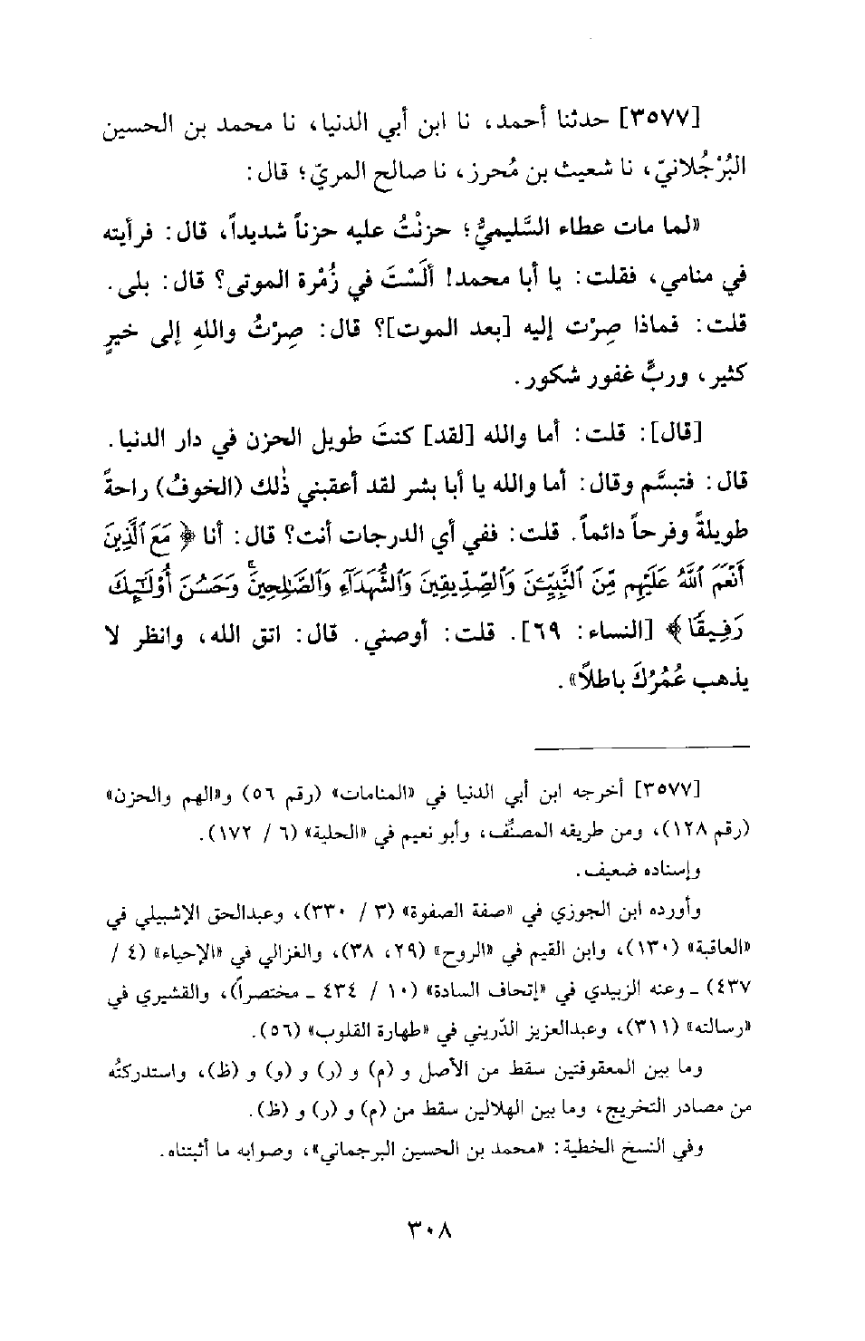 3577 - حَدَّثَنَا أَحْمَدُ، نا ابْنُ أَبِي الدُّنْيَا، نا مُحَمَّدُ بْنُ الْحُسَيْنِ الْبُرْجُلانِيُّ، نا شُعَيْثُ بْنُ مُحْرِزٍ، نا صَالِحٌ الْمُرِّيُّ؛ قَالَ: لَمَّا مَاتَ عَطَاءٌ السَّلِيمِيُّ؛ حَزِنْتُ عَلَيْهِ حُزْنًا شَدِيدًا، قَالَ: فَرَأَيْتُهُ فِي مَنَامِي، فَقُلْتُ: يَا أَبَا مُحَمَّدٍ! أَلَسْتَ فِي زُمْرَةِ الْمَوْتَى؟ قَالَ: بَلَى. قُلْتُ: فَمَاذَا صِرْتَ إِلَيْهِ [بَعْدَ الْمَوْتِ] ؟ قَالَ: صِرْتُ وَاللهِ إِلَى خَيْرٍ كَثِيرٍ، وَرَبٍّ غَفُورٍ شَكُورٍ. [قَالَ] : قُلْتُ: أَمَا وَاللهِ [لَقَدْ] كُنْتَ طَوِيلَ الْحُزْنِ فِي دَارِ الدُّنْيَا. قال: فتبسم وقال: أما وَاللهِ يَا أَبَا بِشْرٍ لَقَدْ أَعْقَبَنِي ذَلِكَ الْخَوْفُ رَاحَةً طَوِيلَةً وَفَرَحًا دَائِمًا. قُلْتُ: فَفِي أَيِّ الدَّرَجَاتِ أَنْتَ؟ قَالَ: أَنَا {مَعَ الَّذِينَ أَنْعَمَ اللهُ عَلَيْهِمْ مِنَ النَّبِيِّينَ وَالصِّدِّيقِينَ وَالشُّهَدَاءِ وَالصَّالِحِينَ وَحَسُنَ أُولَئِكَ رَفِيقًا} [النساء: 69] . قُلْتُ: أَوْصِنِي. قَالَ: اتَّقِ اللهَ، وَانْظُرْ لا يَذْهَبُ عُمُرُكَ بَاطِلا.