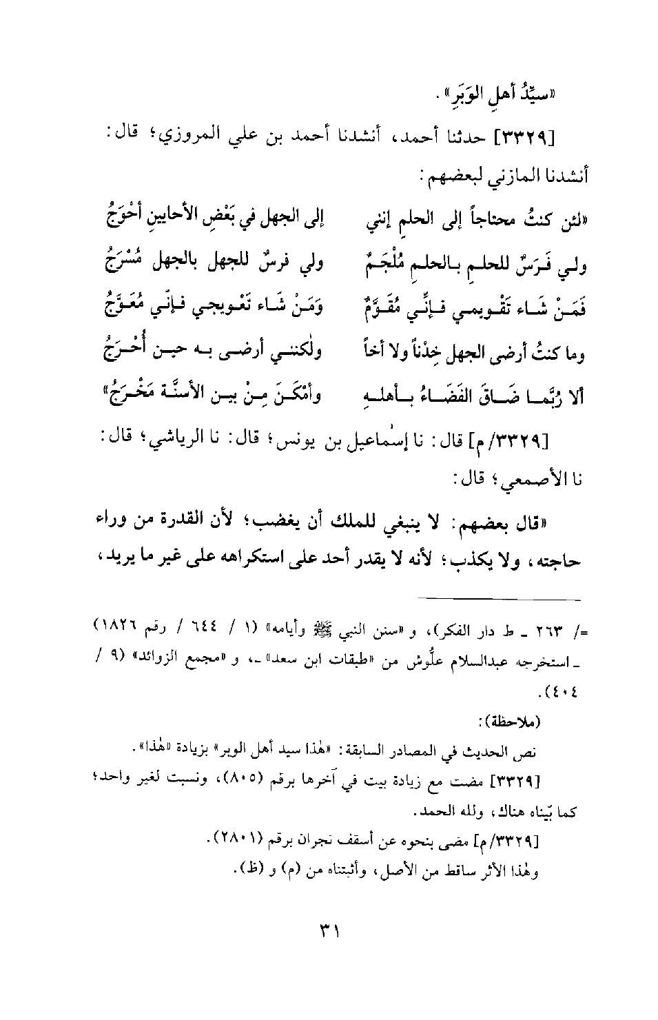 3329 - حَدَّثَنَا أَحْمَدُ، أَنْشَدَنَا أَحْمَدُ بْنُ عَلِيٍّ الْمَرْوَزِيُّ؛ قَالَ: أَنْشَدَنَا الْمَازِنِيُّ لِبَعْضِهِمْ: