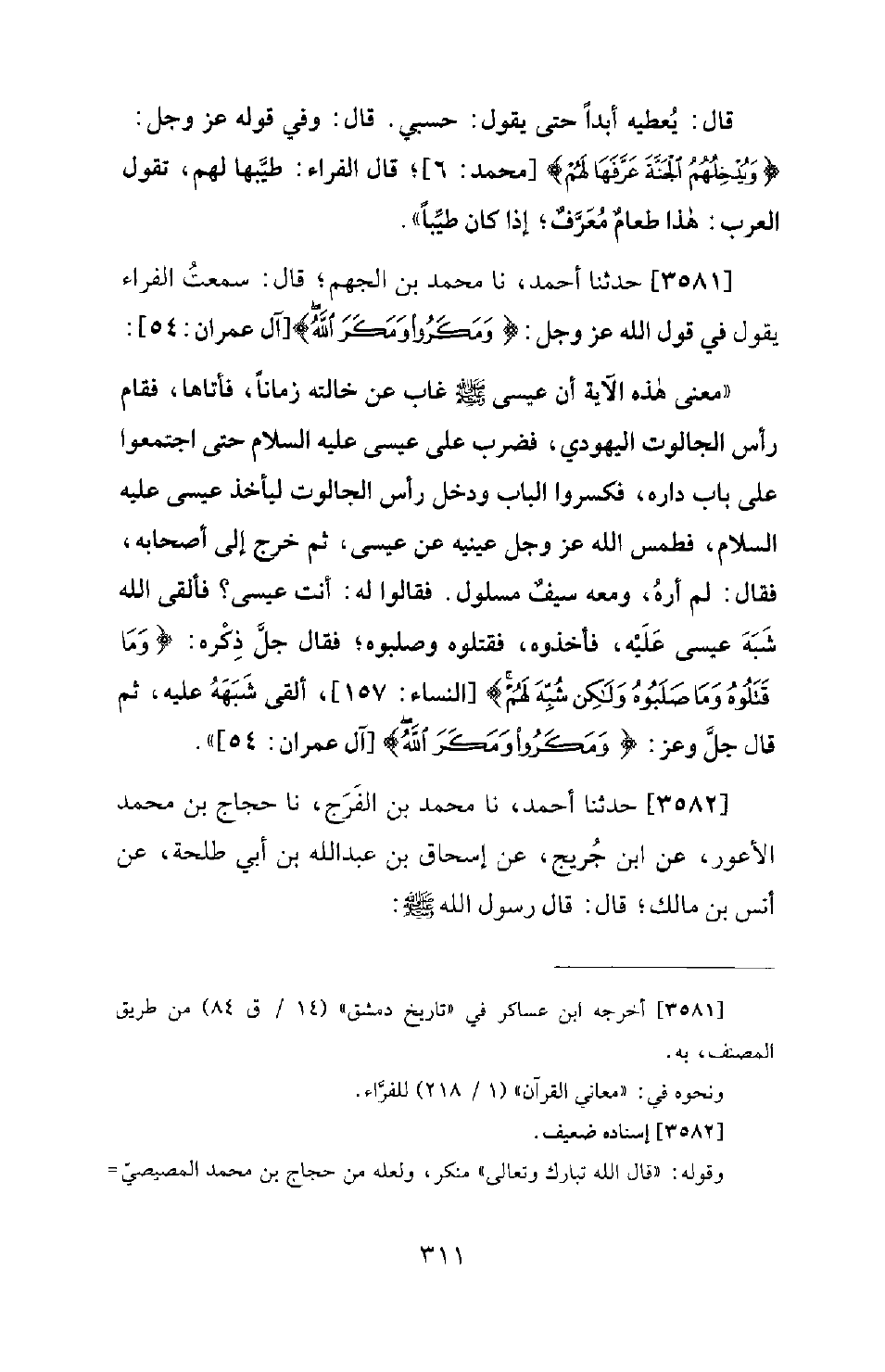 3581 - حَدَّثَنَا أَحْمَدُ، نا مُحَمَّدُ بْنُ الْجَهْمِ؛ قَالَ: سَمِعْتُ الْفَرَّاءَ يَقُولُ فِي قَوْلِ اللهِ عَزَّ وَجَلَّ: {وَمَكَرُوا وَمَكَرَ الله} [آل عمران: 54] : مَعْنَى هَذِهِ الآيَةِ أَنَّ عِيسَى [صَلَّى اللَّهُ عَلَيْهِ وَسَلَّمَ] غَابَ عَنْ خَالَتِهِ زَمَانًا، فَأَتَاهَا، فَقَامَ رَأْسُ الْجَالُوتِ الْيَهُودِيُّ، فَضَرَبَ عَلَى عِيسَى عَلَيْهِ السَّلامُ حَتَّى اجْتَمَعُوا عَلَى بَابِ دَارِهِ، فَكَسَرُوا الْبَابَ وَدَخَلَ رَأْسُ الْجَالُوتِ لِيَأْخُذَ عِيسَى عَلَيْهِ السَّلامُ، فَطَمَسَ اللهُ عَزَّ وَجَلَّ عَيْنَيْهِ عَنْ عِيسَى، ثُمَّ خَرَجَ إِلَى أَصْحَابِهِ، فَقَالَ: لَمْ أَرَهُ، وَمَعَهُ سَيْفٌ مَسْلُولٌ. فَقَالُوا لَهُ: أَنْتَ عِيسَى. فَأَلْقَى اللهُ شَبَهَ عِيسَى عَلَيْهِ، فَأَخَذُوهُ، فَقَتَلُوهُ وَصَلَبُوهُ؛ فَقَالَ جَلَّ ذِكْرُهُ: {وَمَا قَتَلُوهُ وَمَا صَلَبُوهُ وَلَكِنْ شُبِّهَ لَهُمْ} [النساء: 157] ، أَلْقَى شَبَهَهُ عَلَيْهِ، ثُمَّ قَالَ جَلَّ وَعَزَّ: {وَمَكَرُوا ومكر الله} [آل عمران: 54] .