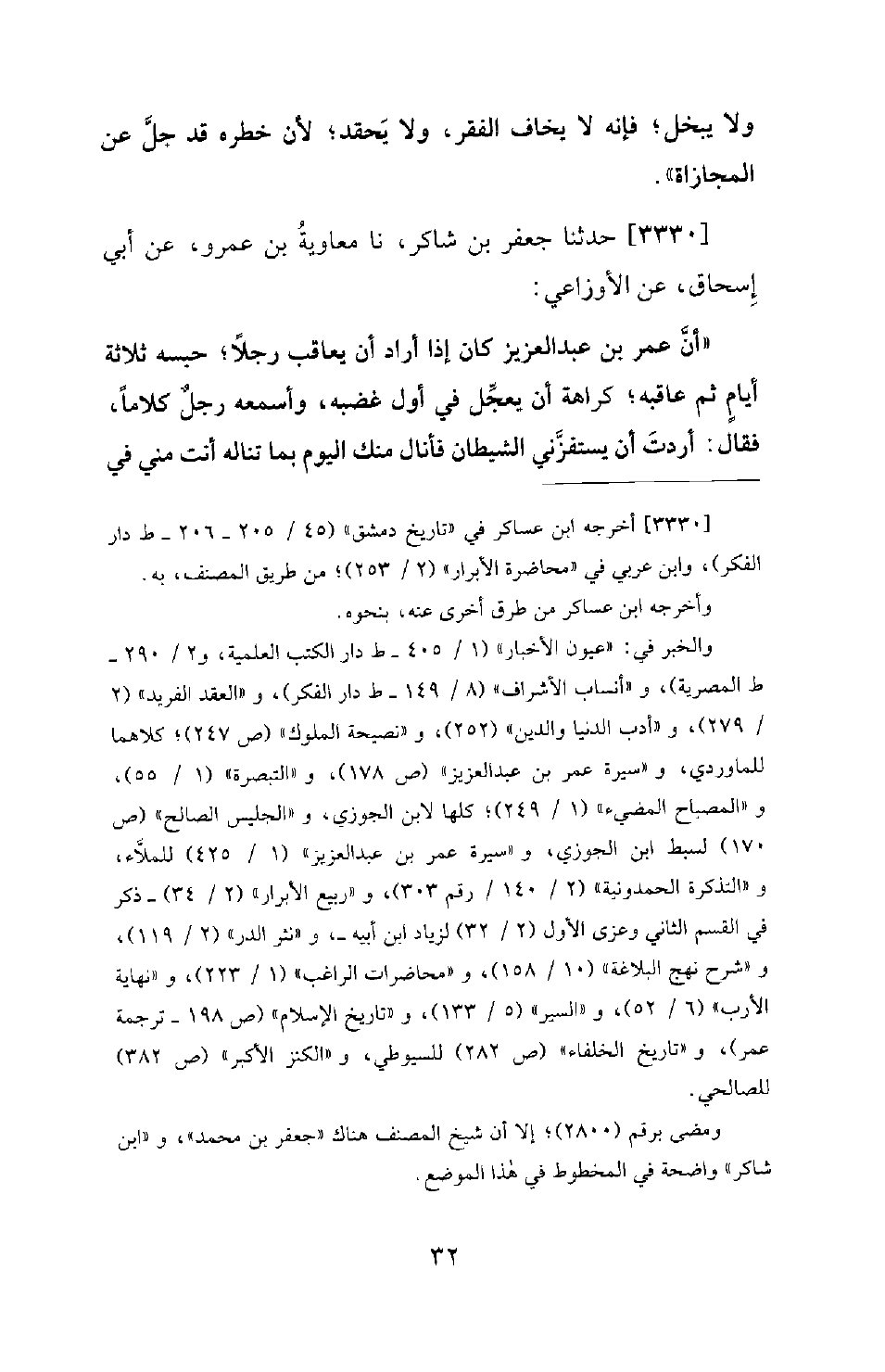 3330 - حَدَّثَنَا جَعْفَرُ بْنُ شَاكِرٍ، نا مُعَاوِيَةُ بْنُ عَمْرٍو، عَنْ أَبِي إِسْحَاقَ، عَنِ الأَوْزَاعِيِّ: أَنَّ عُمَرَ بْنَ عَبْدِ الْعَزِيزِ كَانَ إِذَا أَرَادَ أَنْ يُعَاقِبَ رَجُلا؛ حَبَسَهُ ثَلاثَةَ أَيَّامٍ ثُمَّ عَاقَبَهُ؛ كَرَاهَةَ أَنْ يُعَجِّلَ فِي أَوَّلِ غَضَبِهِ، وَأَسْمَعَهُ رَجُلٌ كَلامًا، فَقَالَ: أَرَدْتُ أَنْ يَسْتَفِزَّنِي الشَّيْطَانُ فَأَنَالَ مِنْكَ الْيَوْمَ بِمَا تَنَالُهُ أَنْتَ مِنِّي فِي -[33]- يَوْمِ الْقِيَامَةِ، انْصَرِفْ عَنِّي عَافَاكَ اللهُ وَرَحِمَكَ.