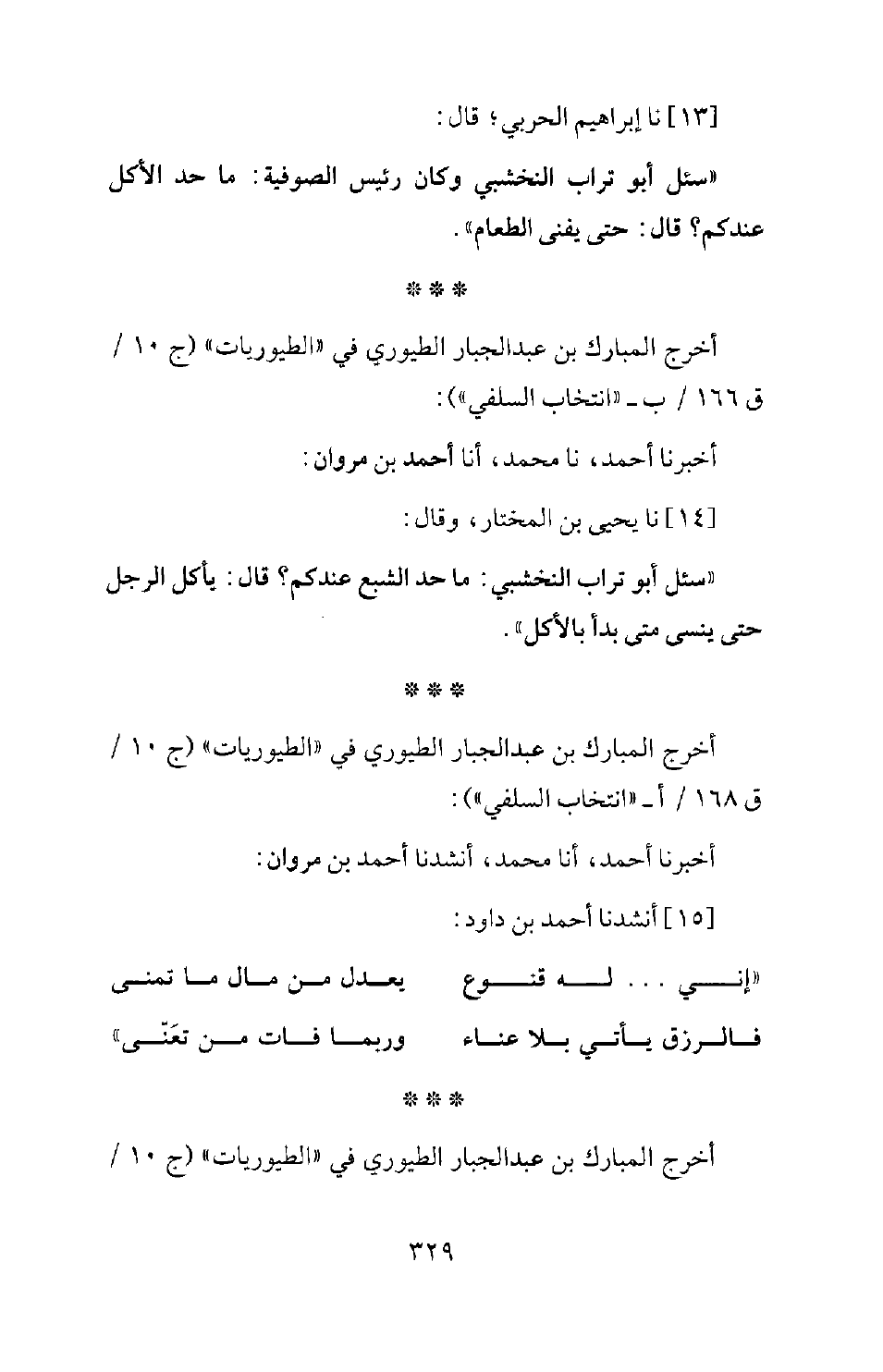14 - نا يَحْيَى بْنُ الْمُخْتَارِ، قَالَ: سُئِلَ أَبُو تُرَابٍ النَّخْشَبِيُّ، مَا حَدُّ الشِّبَعِ عِنْدَكُمْ؟ قَالَ: " يَأْكُلُ الرَّجُلُ حَتَّى يَنْسَى مَتَى بَدَأَ بِالأَكْلِ "