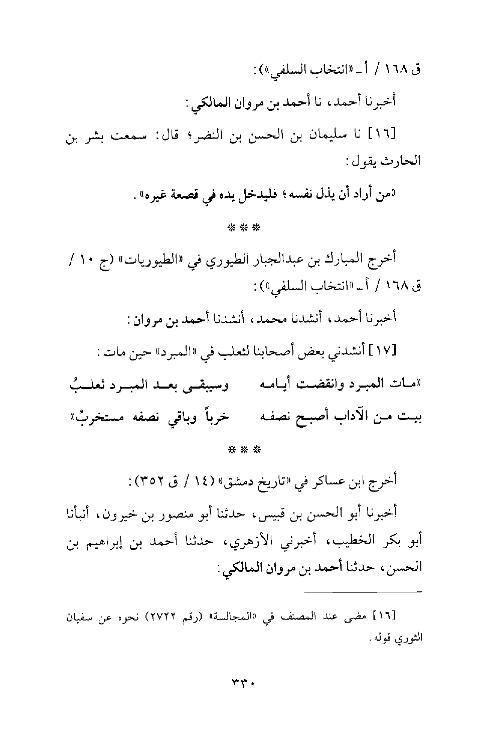 أخبرنا أبو الحسن بن قبيس، حدثنا أبو منصور بن خيرون، أنبأنا أبو بكر الخطيب، أخبرنى الأزهرى، حدثنا أبو منصور بن خيرون أنبأنا أبو بكر الخطيب، أخبرنى الأزهرى، حدثنا احمد بن إبراهيم بن الحسن، حدثنا أحمد بن مروان المالكى:
