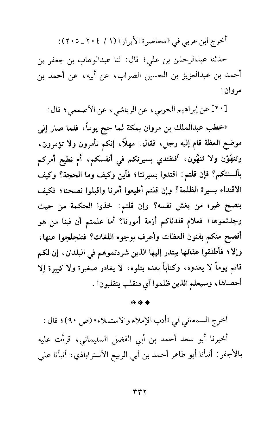 20 - عَنْ إِبْرَاهِيمَ الْحَرْبِيِّ، عَنِ الرِّيَاشِيِّ، عَنِ الأَصْمَعِيِّ، قَالَ: " خَطَبَ عَبْدُ الْمَلِكِ بْنِ مَرْوَانَ بِمَكَّةَ لَمَّا حَجَّ يَوْمًا، فَلَمَّا صَارَ إِلَى مَوْضِعِ الْعِظَةِ قَامَ إِلَيْهِ رَجُلٌ، فَقَالَ: مَهْلا، إِنَّكُمْ تَأْمُرُونَ وَلا تُؤْمَرُونَ، وَتَنْهَوْنَ وَلا تُنْهَوْنَ، أَفَنْقَتَدِي بِسِيرَتِكُمْ فِي أَنْفُسِكُمْ، أَمْ نُطِيعُ أَمْرَكُمْ بِأَلْسِنَتِكُمْ؟ فَإِنْ قُلْتُمْ: اقْتَدُوا بِسِيرَتِنَا، فَأَيْنَ وَكَيْفَ وَمَا الْحُجَّةُ؟ وَكَيْفَ الاقْتِدَاءُ بِسِيرَةِ الظَّلَمَةِ؟ وَإِنْ قُلْتُمْ: أَطِيعُوا أَمْرَنَا وَاقْبَلُوا نُصْحَنَا، فَكَيْفَ يَنْصَحُ غَيْرَهُ مَنْ يَغُشُّ نَفْسَهُ؟ وَإِنْ قُلْتُمْ: خُذُوا الْحِكْمَةَ مِنْ حَيْثُ وَجَدْتُمُوهَا، فَعَلامَ قَلَّدْنَاكُمْ أَزِمَّةَ أُمُورِنَا؟ أَمَا عَلِمْتُمْ أَنَّ فِينَا مَنْ هُوَ أَفْصَحُ مِنْكُمْ بِفُنُونِ الْعِظَاتِ، وَأَعْرَفُ بِوُجُوهِ اللُّغَاتِ، فَتَلَجْلَجُوا عَنْهَا، وَإِلا، فَأَطْلِقُوا عِقَالَهَا يَبْتَدِرُ إِلَيْهِ الَّذِينَ شَرَّدْتُمُوهُمْ فِي الْبُلْدَانِ إِنْ لَكُمْ قَائِمًا يَوْمًا لا يَعْدُوهُ، وَكِتَابًا بَعْدَهُ لا يَتْلُوهُ، لا يُغَادِرُ صَغِيرَةً وَلا كَبِيرَةً إِلا أَحْصَاهَا، وَسَيَعْلَمُ الَّذِينَ ظَلَمُوا أَيَّ مُنْقَلَبٍ يَنْقَلِبُونَ "
