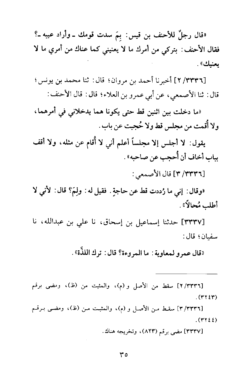 3336 - / 2 م - أَخْبَرَنَا أَحْمَدُ بْنُ مَرْوَانَ؛ قَالَ: ثنا مُحَمَّدُ بْنُ يُونُسَ؛ قَالَ: ثنا الأَصْمَعِيُّ، عَنْ أَبِي عَمْرِو بْنِ الْعَلاءِ؛ قَالَ: قَالَ الأَحْنَفُ: مَا دَخَلْتُ بَيْنَ اثْنَيْنِ قَطُّ حَتَّى يَكُونَا هُمَا يُدْخِلانِي فِي أَمْرِهِمَا، وَلا أُقِمْتُ مِنْ مَجْلِسٍ قَطُّ وَلا حُجِبْتُ عَنْ بَابٍ. يقول: لا أجلس إِلا مَجْلِسًا أَعْلَمُ أَنِّي لا أُقَامُ عَنْ مِثْلِهِ، وَلا أَقِفُ بِبَابٍ أَخَافُ أَنْ أُحْجَبَ عَنْ صَاحِبِهِ.