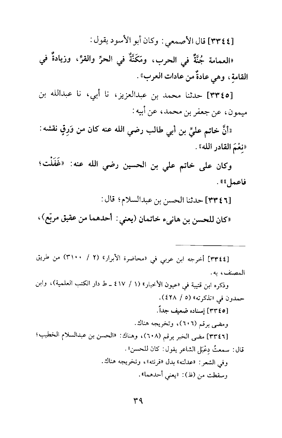 3344 - قَالَ الأَصْمَعِيُّ: وَكَانَ أَبُو الأَسْوَدِ يَقُولُ: الْعِمَامَةُ جُنَّةٌ فِي الْحَرْبِ، وَمَكَنَّةٌ فِي الْحَرِّ وَالْقَرِّ، وَزِيَادَةٌ فِي الْقَامَةِ، وَهِيَ عَادَةٌ مِنْ عَادَاتِ الْعَرَبِ.