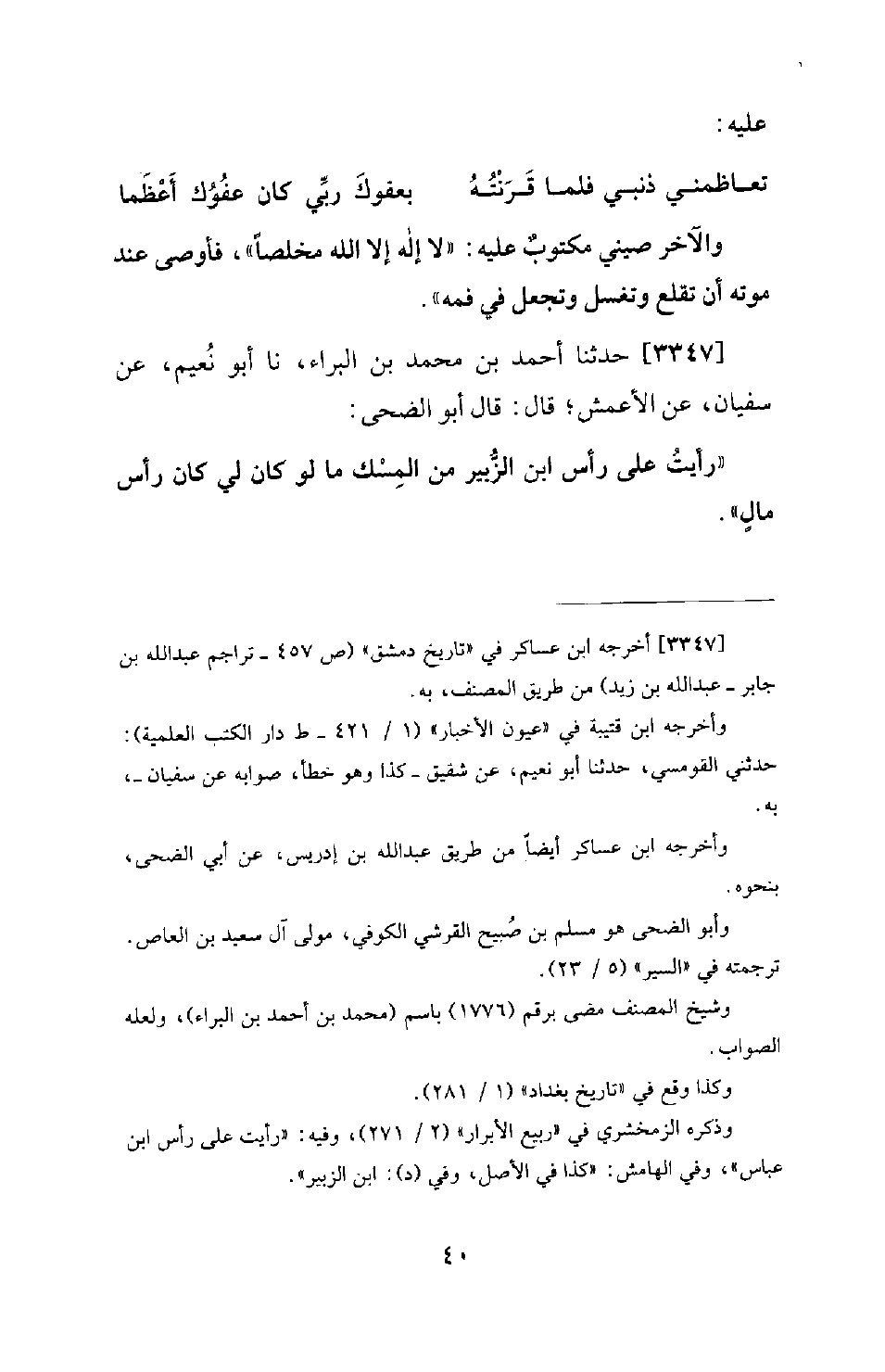 3347 - حَدَّثَنَا أَحْمَدُ بْنُ مُحَمَّدِ بْنِ الْبَرَاءِ، نا أَبُو نُعَيْمٍ، عَنْ سُفْيَانَ، عَنِ الأَعْمَشِ؛ قَالَ: قَالَ أَبُو الضُّحَى: رَأَيْتُ عَلَى رَأْسِ ابْنِ الزُّبَيْرِ مِنَ الْمِسْكِ مَا لَوْ كَانَ لِي كَانَ رَأْسَ مَالٍ.