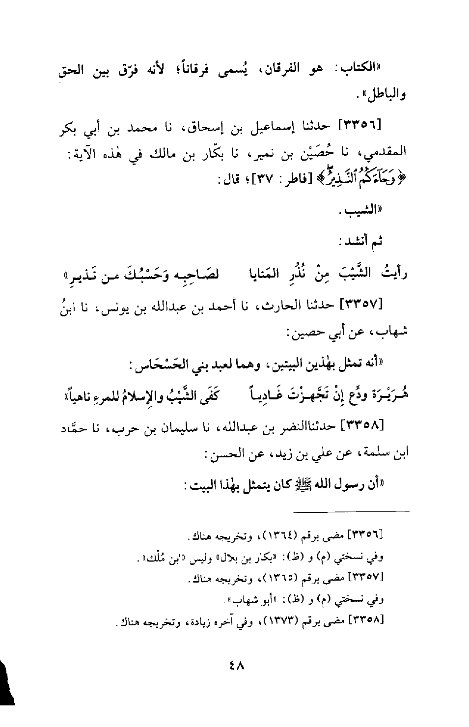 3356 - حَدَّثَنَا إِسْمَاعِيلُ بْنُ إِسْحَاقَ، نا مُحَمَّدُ بْنُ أَبِي بَكْرٍ الْمُقَدَّمِيُّ، نا حُصَيْنُ بْنُ نُمَيْرٍ، نا بَكَّارُ بْنُ مَالِكٍ فِي هَذِهِ الآيَةِ: {وجاءكم النذير} [فاطر: 37] ؛ قَالَ: الشَّيْبُ. ثُمَّ أَنْشَدَ: