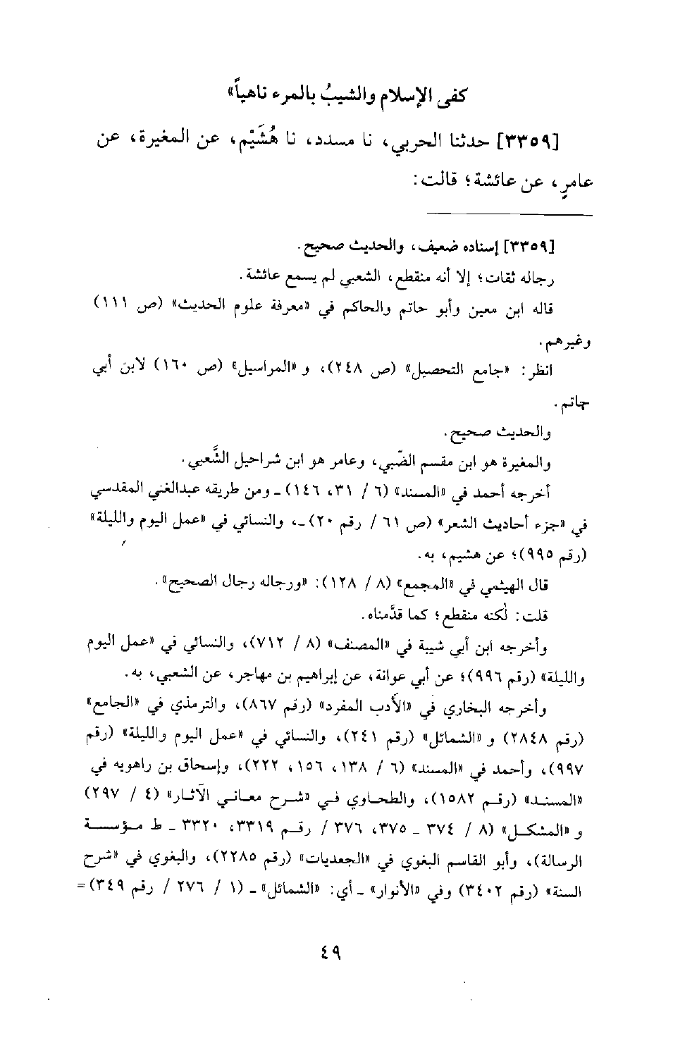 3359 - حَدَّثَنَا الْحَرْبِيُّ، نا مُسَدَّدٌ، نا هُشَيْمٌ، عَنِ الْمُغِيرَةِ، عَنْ عَامِرٍ، عَنْ عَائِشَةَ؛ قَالَتْ: -[52]- كَانَ رَسُولُ اللهِ صَلَّى اللَّهُ عَلَيْهِ وَسَلَّمَ إِذَا اسْتَرَاثَ خَبَرًا؛ يَتَمَثَّلُ بِقَافِيَةِ بَيْتِ طُرْفَةَ: