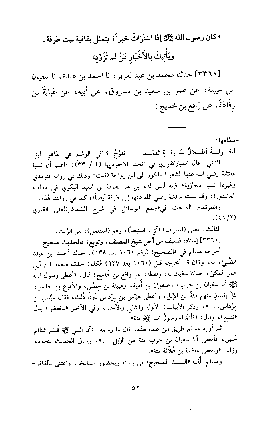3360 - حَدَّثَنَا مُحَمَّدُ بْنُ عَبْدِ الْعَزِيزِ، نا أَحْمَدُ بْنُ عَبَدَةَ، نا سُفْيَانُ بْنُ عُيَيْنَةَ، عَنْ عُمَرَ بْنِ سَعِيدِ بْنِ مَسْرُوقٍ، عَنْ أَبِيهِ، عَنْ عَبَايَةَ بْنِ رِفَاعَةَ، عَنْ رَافِعِ بْنِ خُدَيْجٍ: -[54]- أَنَّ النَّبِيَّ صَلَّى اللَّهُ عَلَيْهِ وَسَلَّمَ أَعْطَى الْمُؤَلَّفَةَ قُلُوبُهُمْ يَوْمَ حنين مئة مئة مِنَ الإِبِلِ، وَأَعْطَى الْعَبَّاسَ بْنَ مِرْدَاسٍ دُونَ ذَلِكَ، فَأَنْشَأَ الْعَبَّاسُ يَقُولُ: