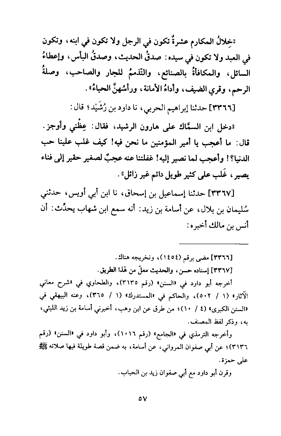 3366 - حَدَّثَنَا إِبْرَاهِيمُ الْحَرْبِيُّ، نا دَاوُدُ بْنُ رُشَيْدٍ؛ قَالَ: دَخَلَ ابْنُ السَّمَّاكِ عَلَى هَارُونَ الرَّشِيدِ، فَقَالَ: عِظْنِي وَأَوْجِزْ. قَالَ: ما أعجب يا أَمِيرَ الْمُؤْمِنِينَ مَا نَحْنُ فِيهِ! كَيْف غَلَبَ عَلَيْنَا حُبُّ الدُّنْيَا؟ ! وَأَعْجَبَ لِمَا نَصِيرُ إِلَيْهِ! غَفْلَتُنَا عَنْهُ، عَجَبٌ لِصَغِيرٍ حَقِيرٍ إِلَى فَنَاءٍ يَصِيرُ، غَلَبَ عَلَى كَثِيرٍ طَوِيلٍ دَائِمٍ غَيْرِ زَائِلٍ.