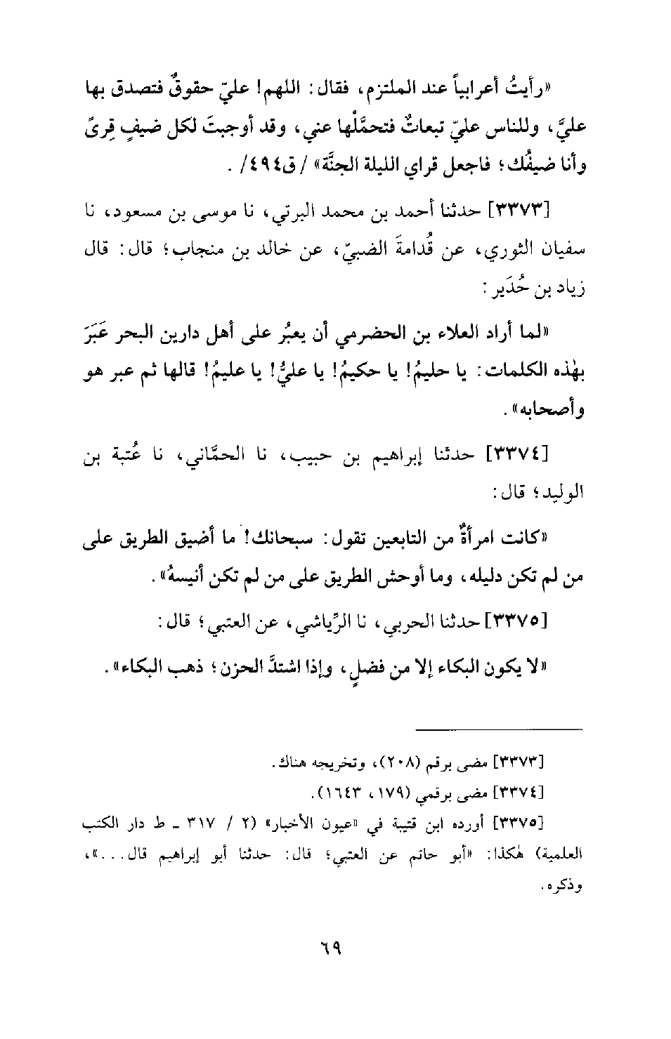 3374 - حَدَّثَنَا إِبْرَاهِيمُ بْنُ حَبِيبٍ، نا الْحِمَّانِيُّ، نا عُتْبَةُ بْنُ الْوَلِيدِ؛ قَالَ: كَانَتِ امْرَأَةٌ مِنَ التَّابِعِينَ: تَقُولُ: سُبْحَانَكَ! مَا أَضْيَقَ الطَّرِيقِ عَلَى مَنْ لَمْ تَكُنْ دَلِيلَهُ، وَمَا أَوْحَشَ الطَّرِيقَ عَلَى مَنْ لَمْ تَكُنْ أَنِيسَهُ!