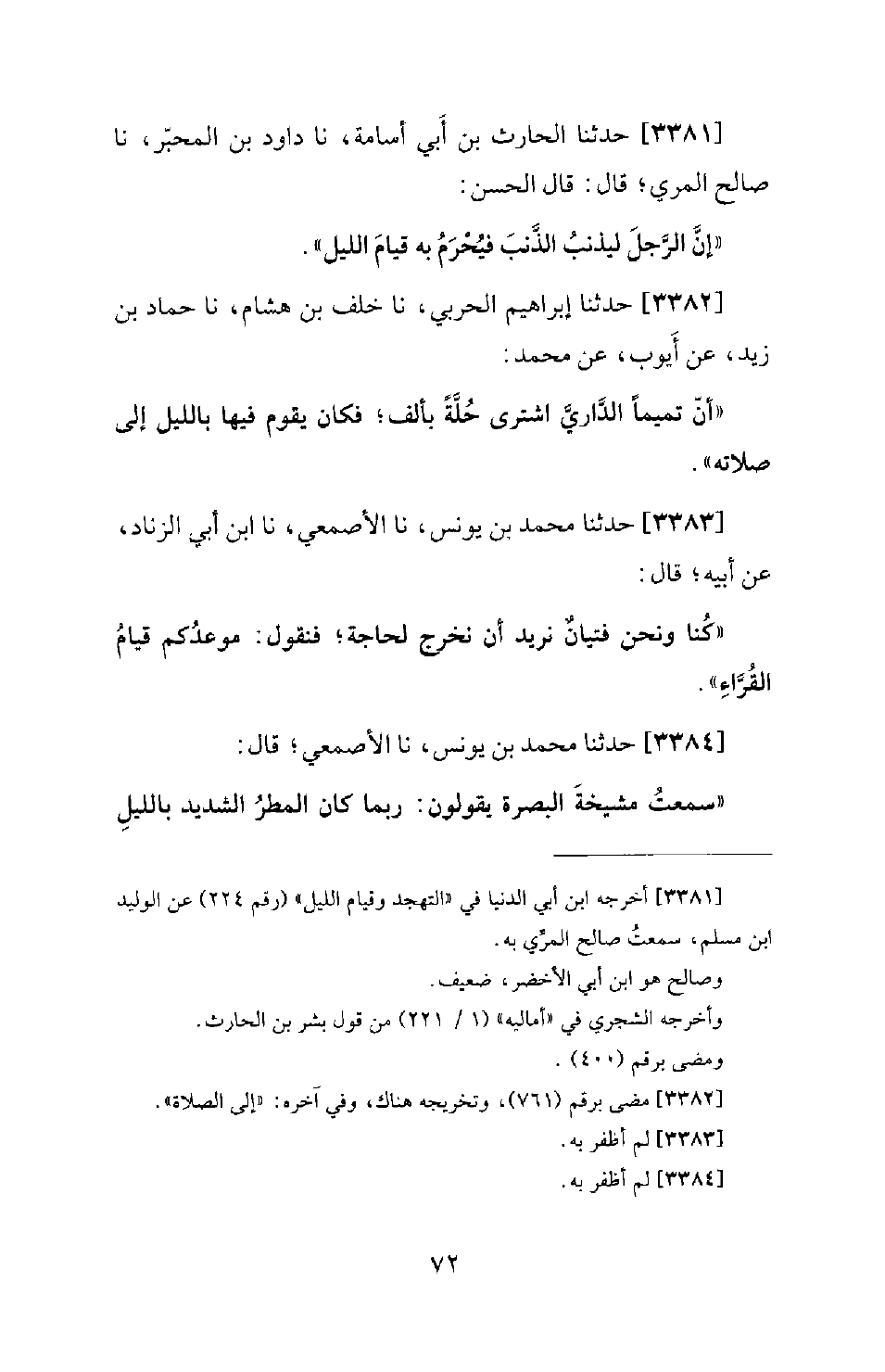 3381 - حَدَّثَنَا الْحَارِثُ بْنُ أَبِي أُسَامَةَ، نا دَاوُدُ بْنُ الْمُحَبَّرِ، نا صَالِحٌ الْمُرِّيُّ؛ قَالَ: قَالَ الْحَسَنُ: إِنَّ الرَّجُلَ لَيُذْنِبُ الذَّنْبَ فَيُحْرَمُ بِهِ قِيَامَ اللَّيْلِ.